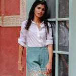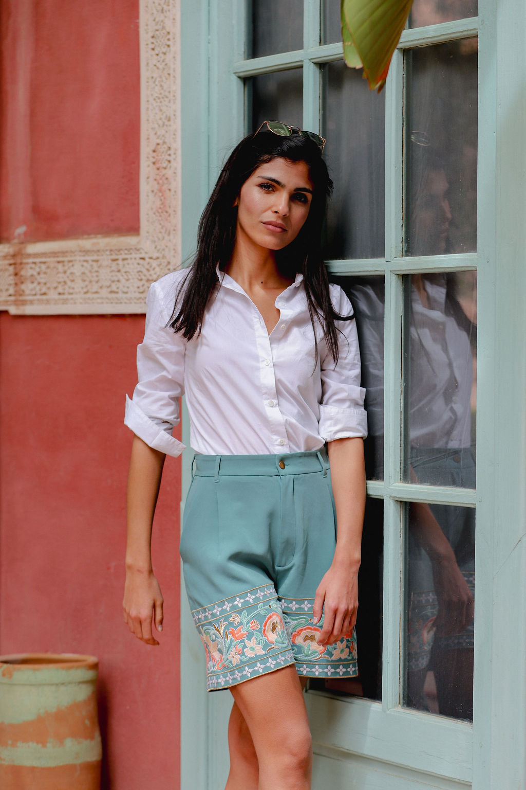 These dusty teal coloured shorts with an embroidered border are a versatile addition to your wardrobe, making these shorts perfect for any occasion, including your next holiday. We've paired it with our Amara Jacket and Amara Bralette for a statement look.