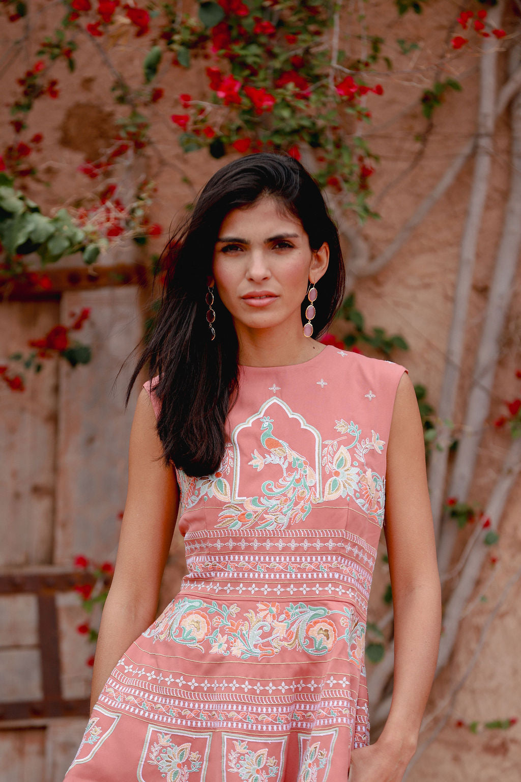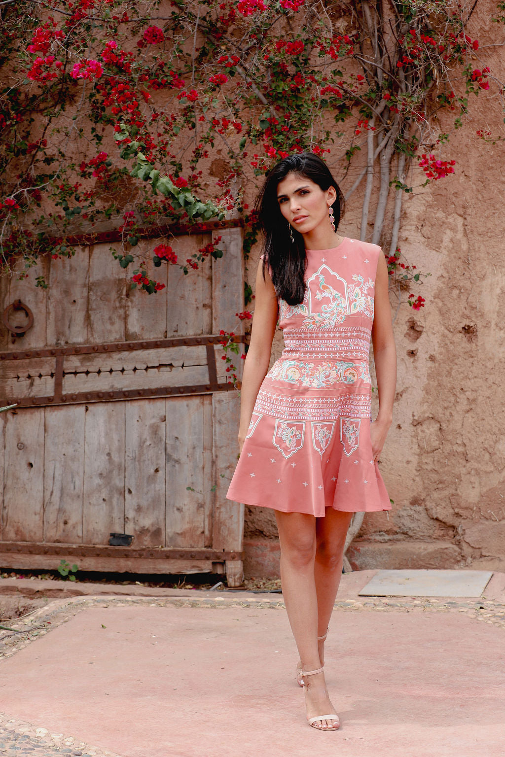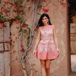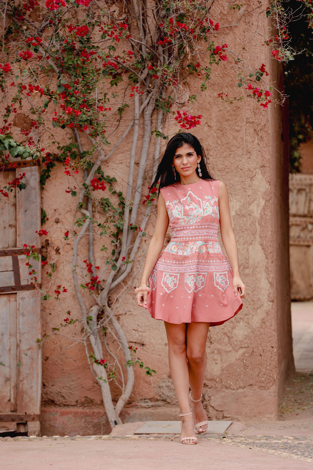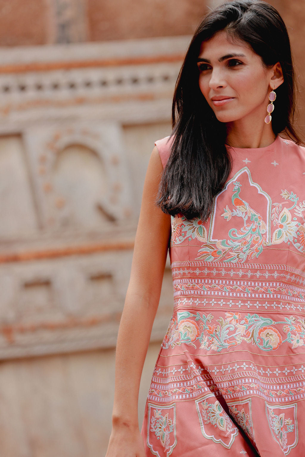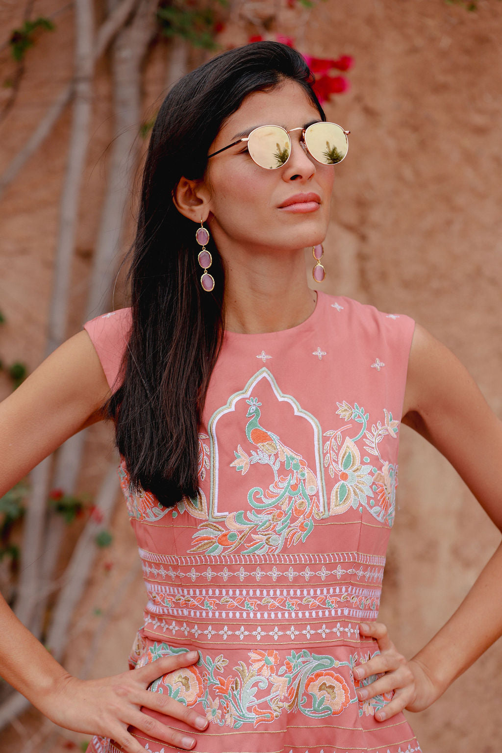 Dusty pink short dress with indian inspired embroidery and flared skrit