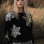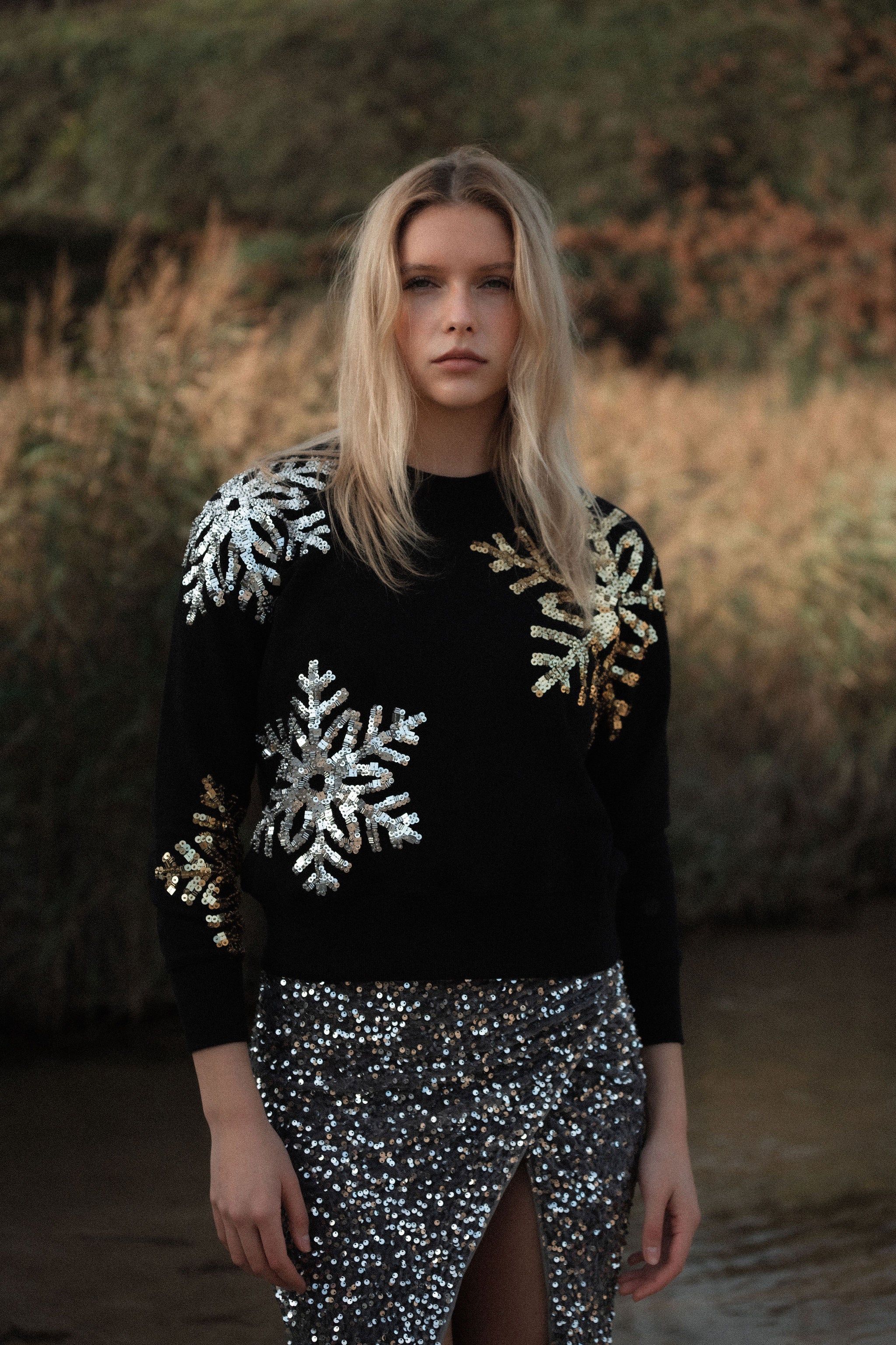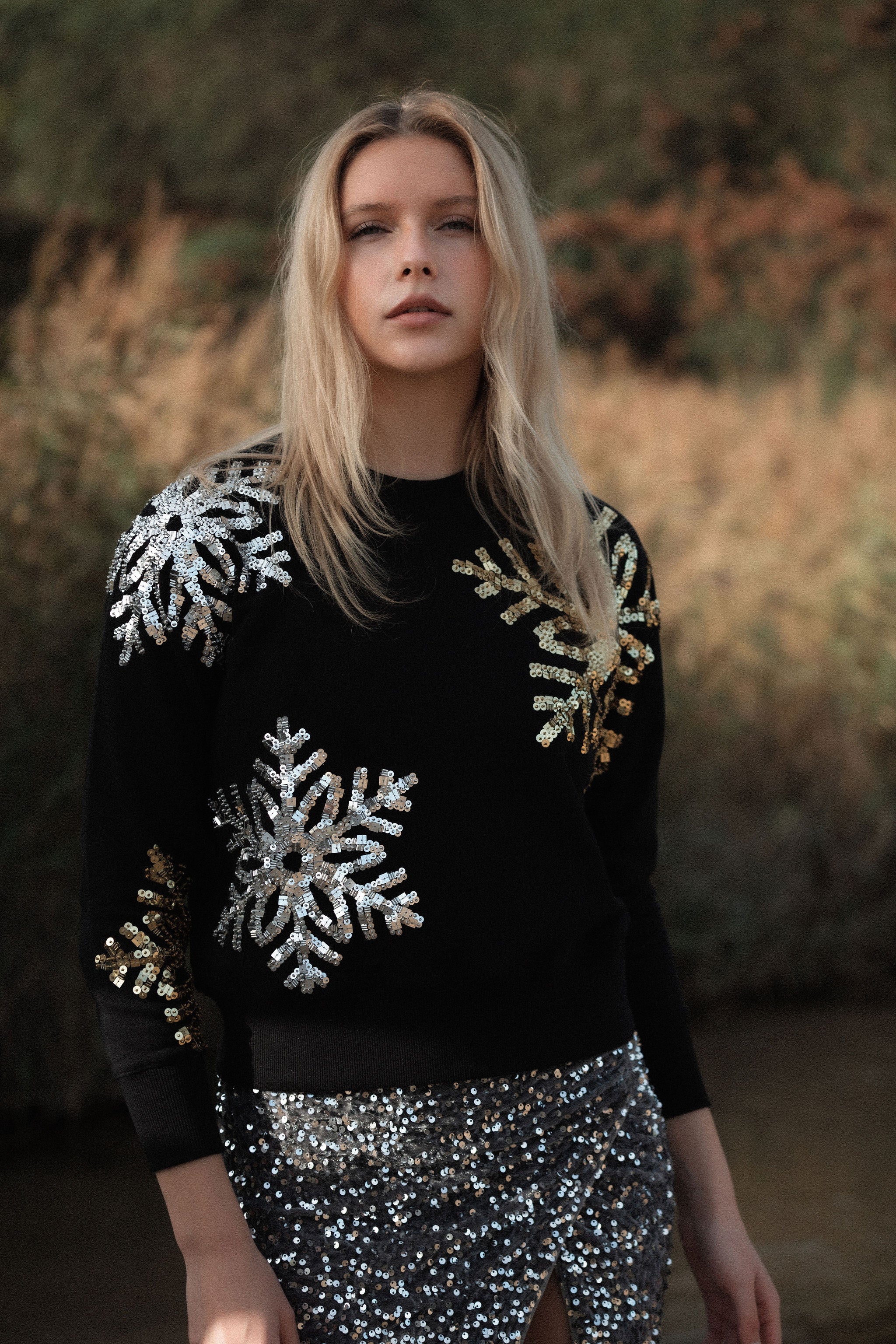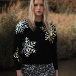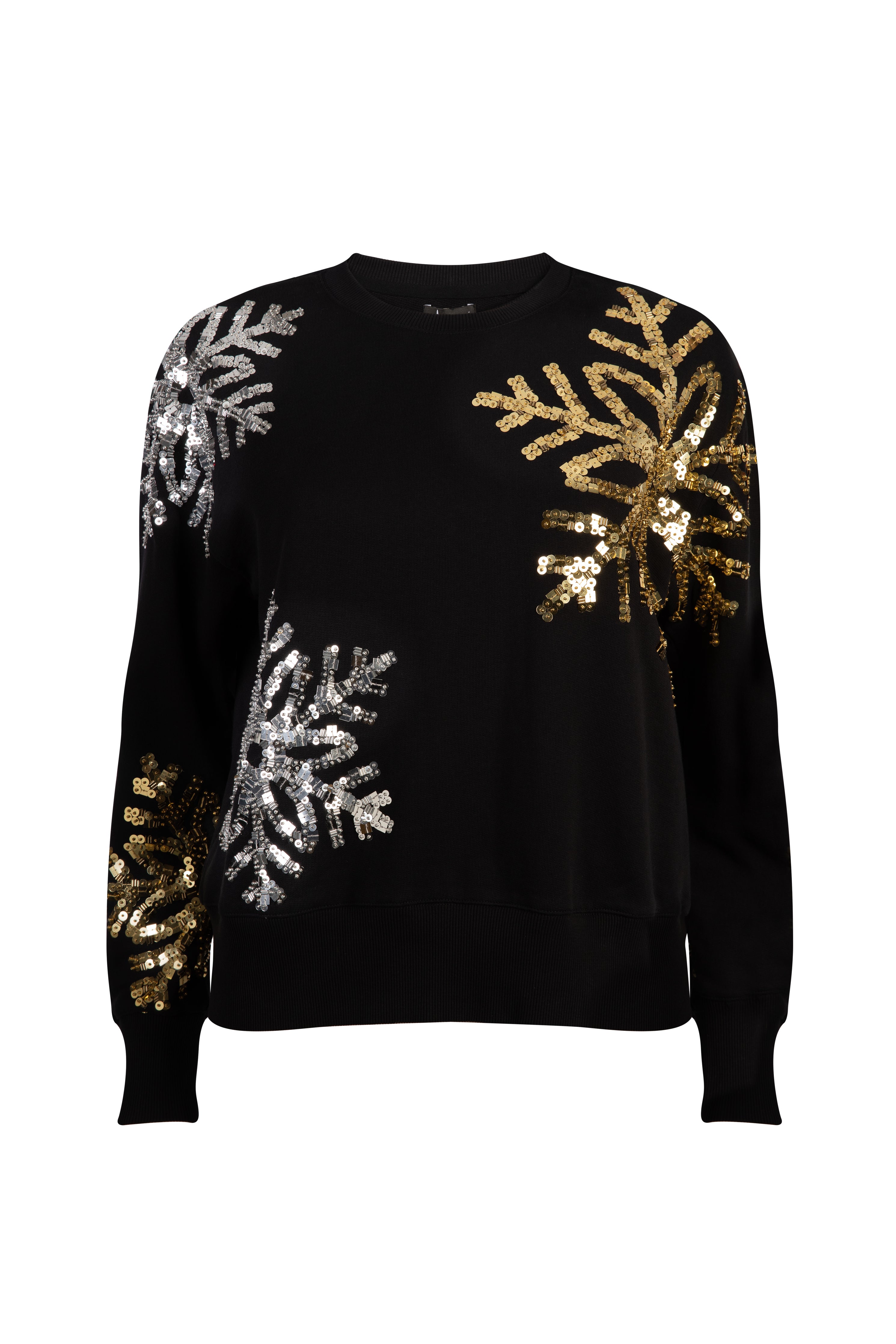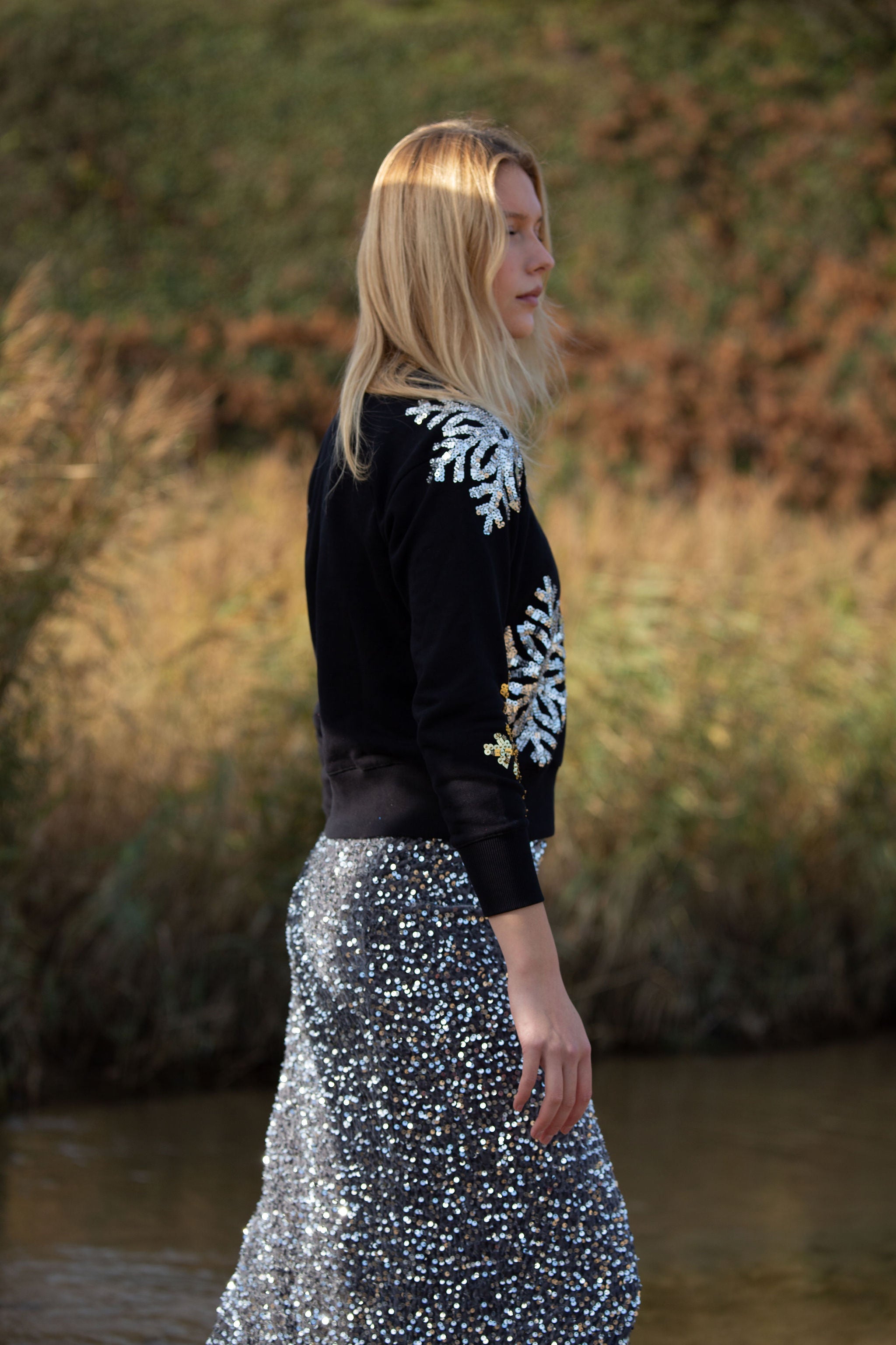 The December Snow Sweatshirt, with glittering embellishment, is a great statement piece to add to your winter wardrobe. It's an easy piece to dress up or down and one you will enjoy wearing throughout the cold months.