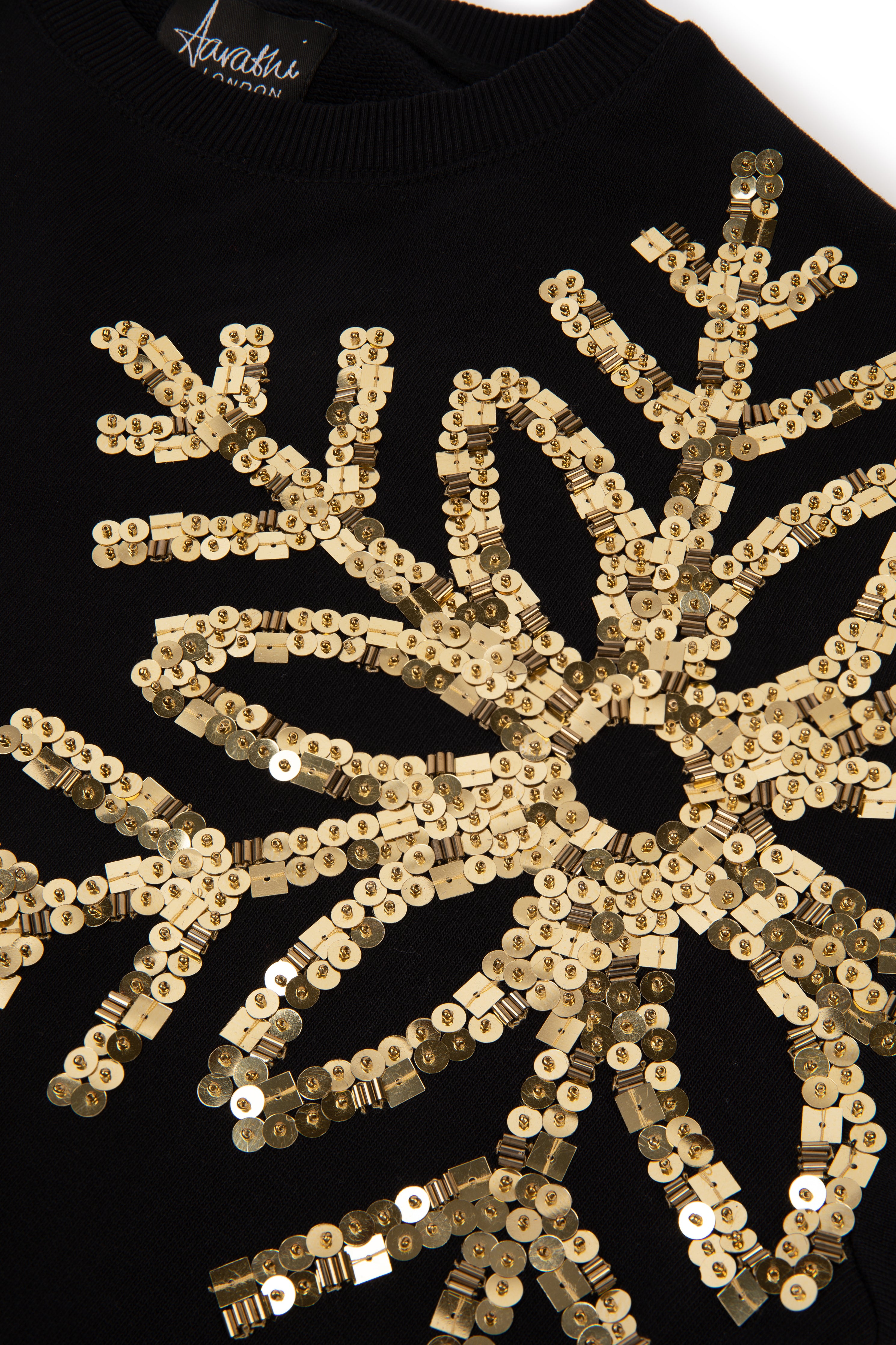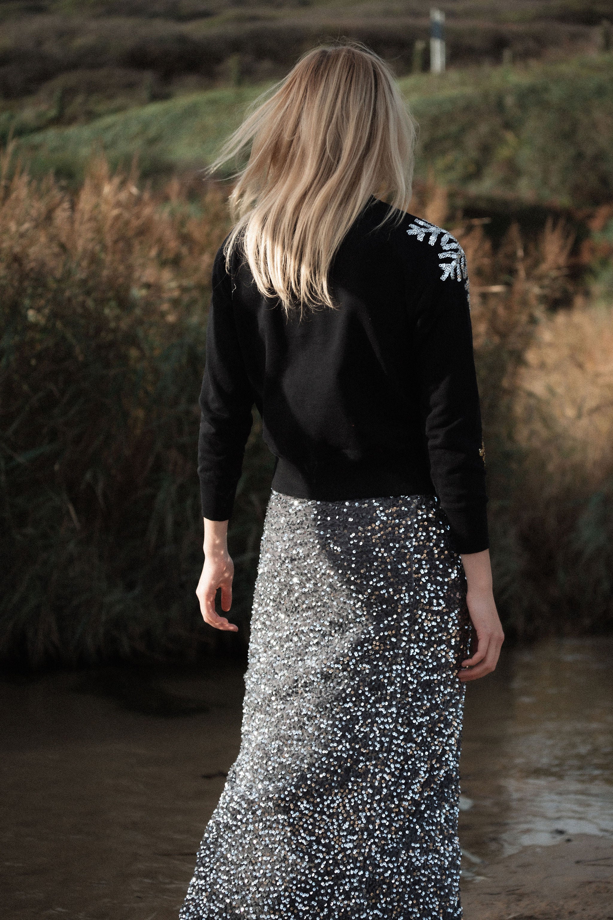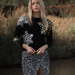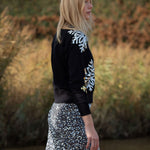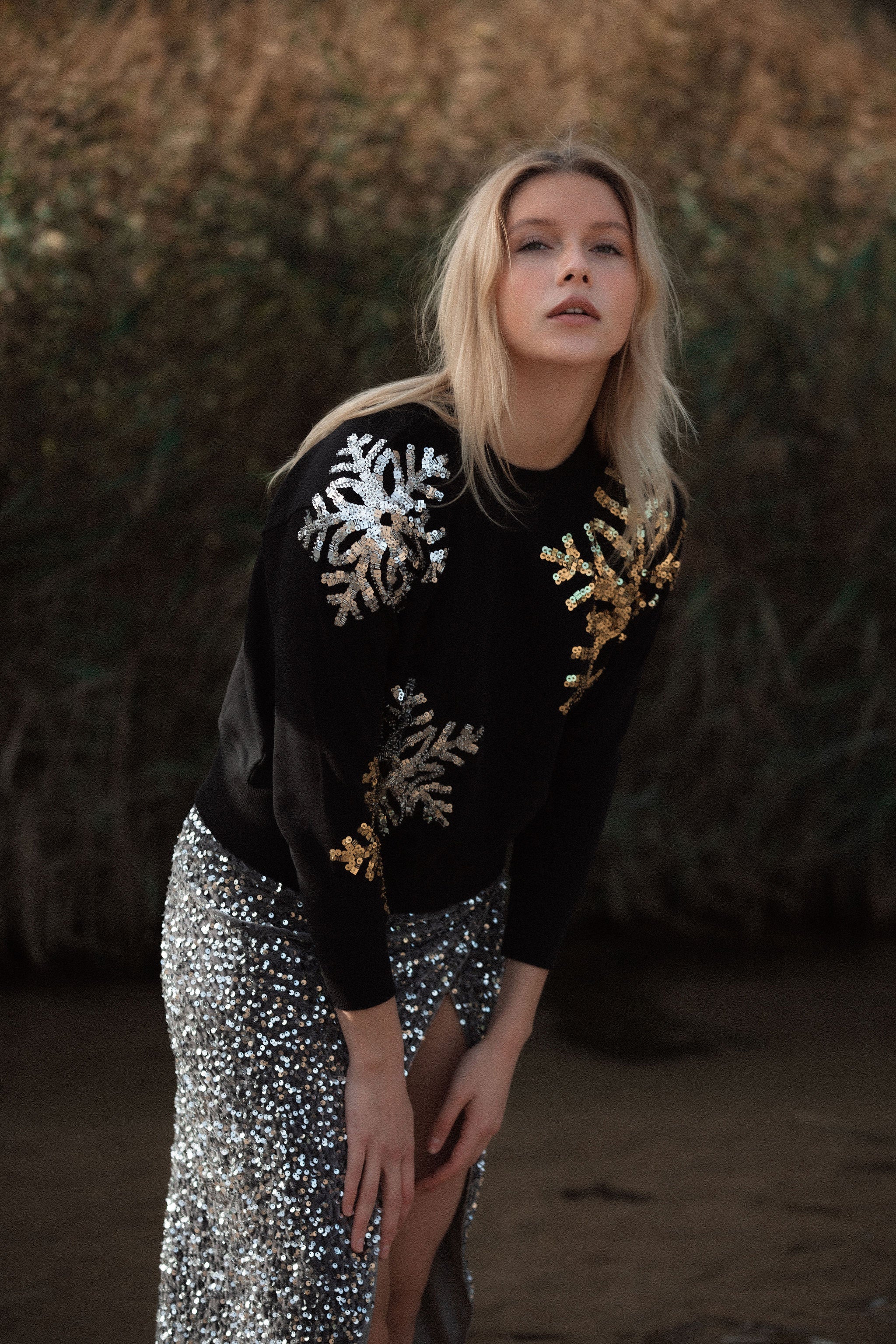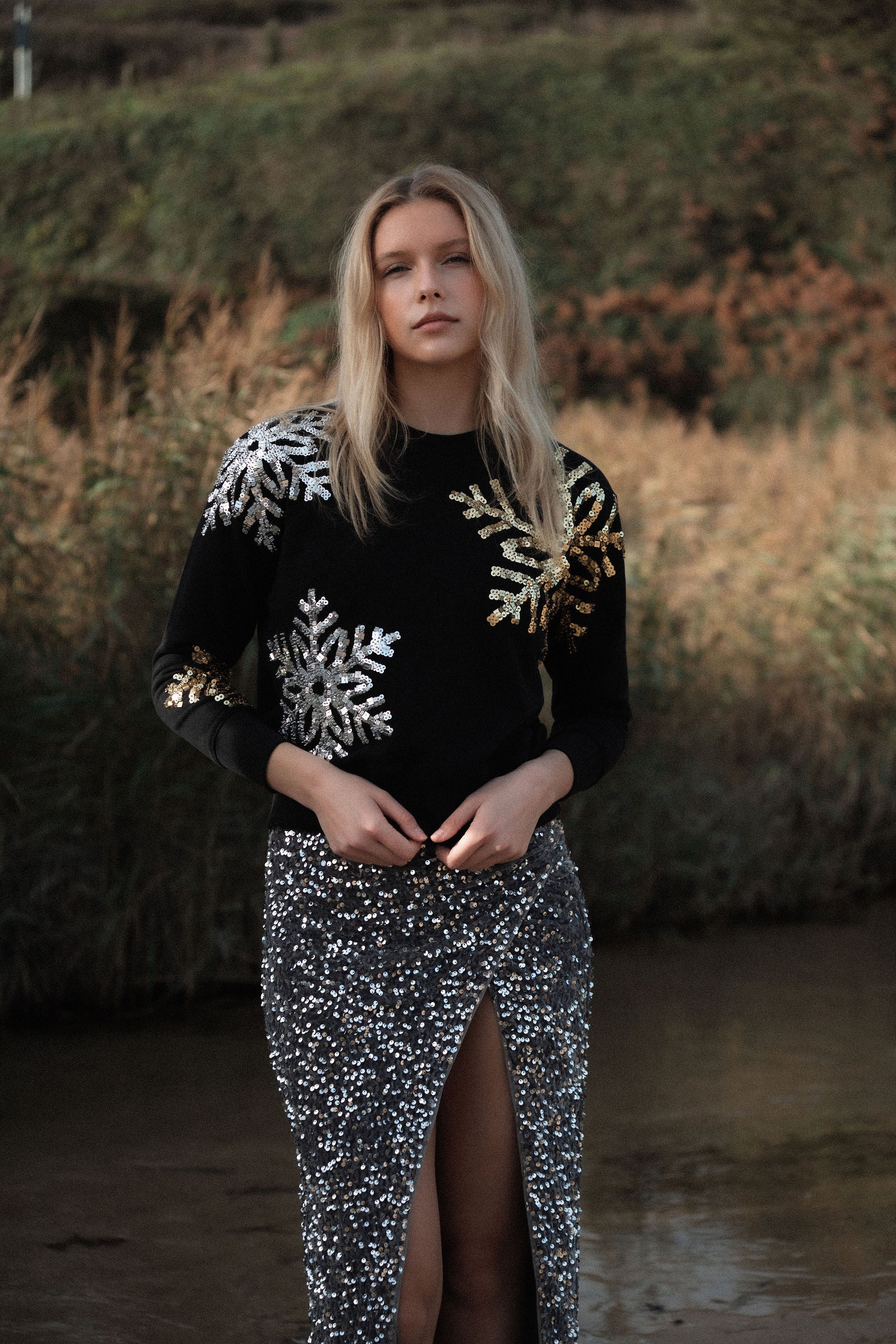 The December Snow Sweatshirt, with glittering embellishment, is a great statement piece to add to your winter wardrobe. It's an easy piece to dress up or down and one you will enjoy wearing throughout the cold months.