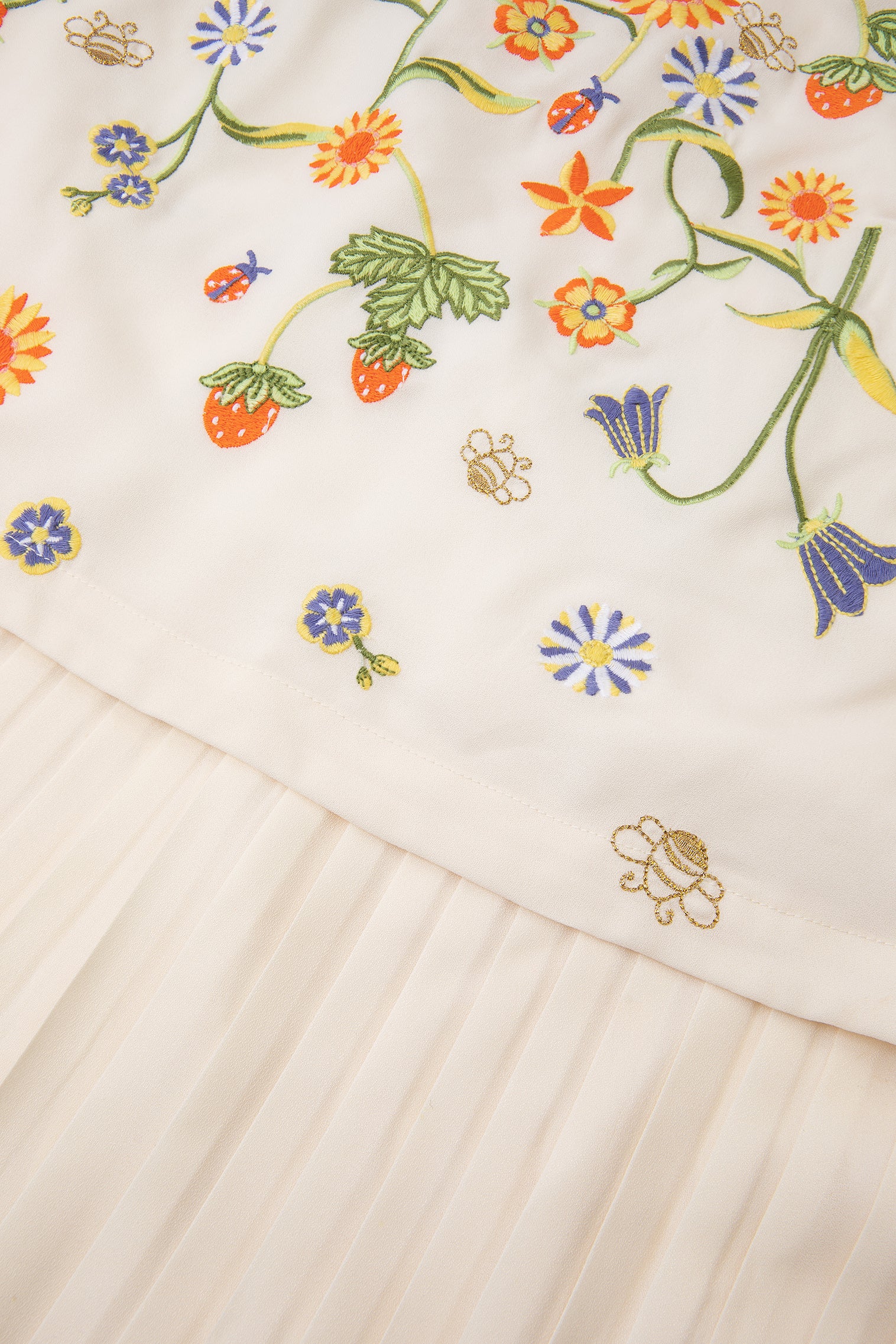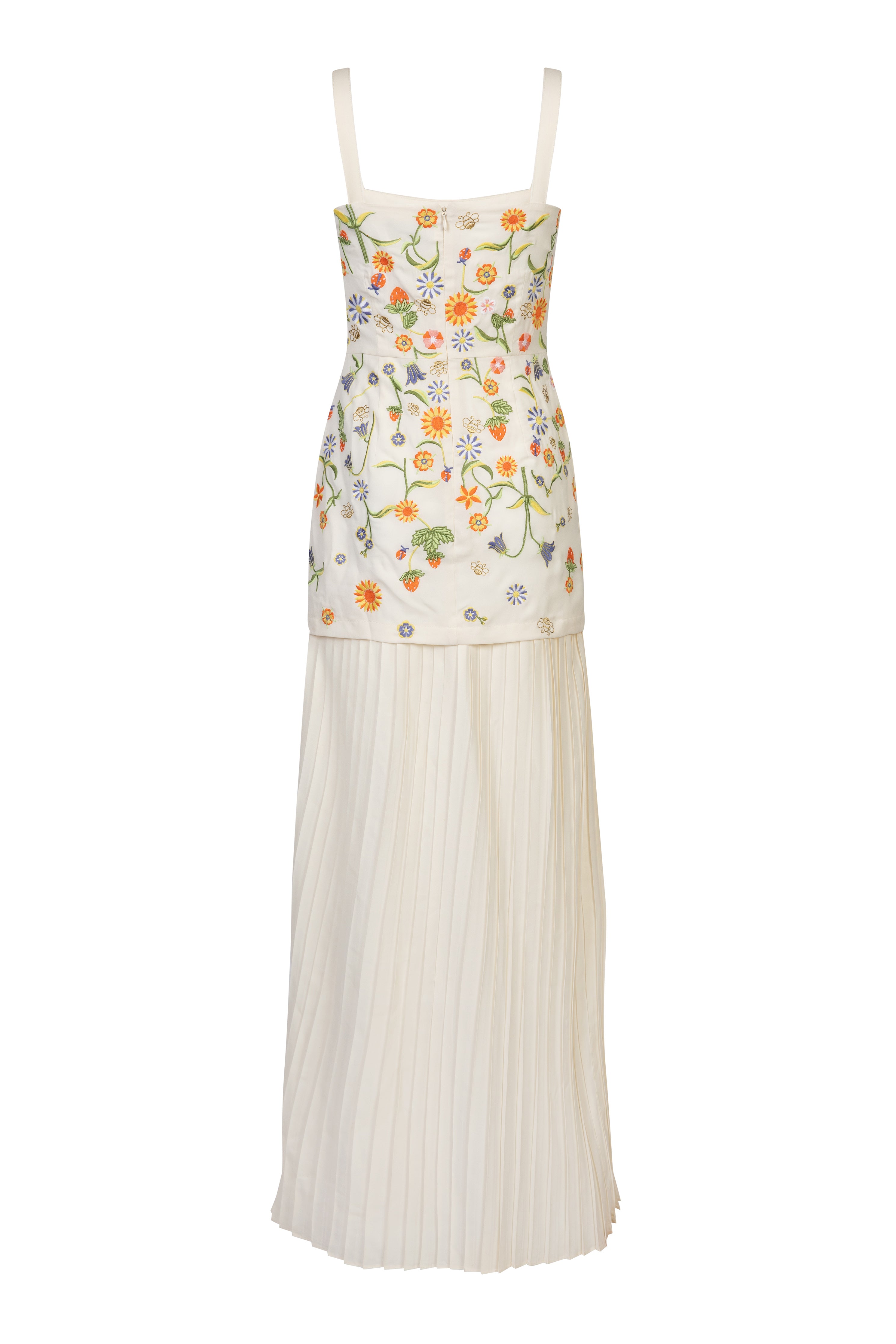 The floral embroidery is a work of art, meticulously crafted to showcase nature's beauty and add a touch of romance. Each delicate stitch tells a story of elegance. The pleat paneling cascading to the floor adds an extra touch of luxury and creates a dramatic and ethereal effect as you glide through the room.