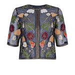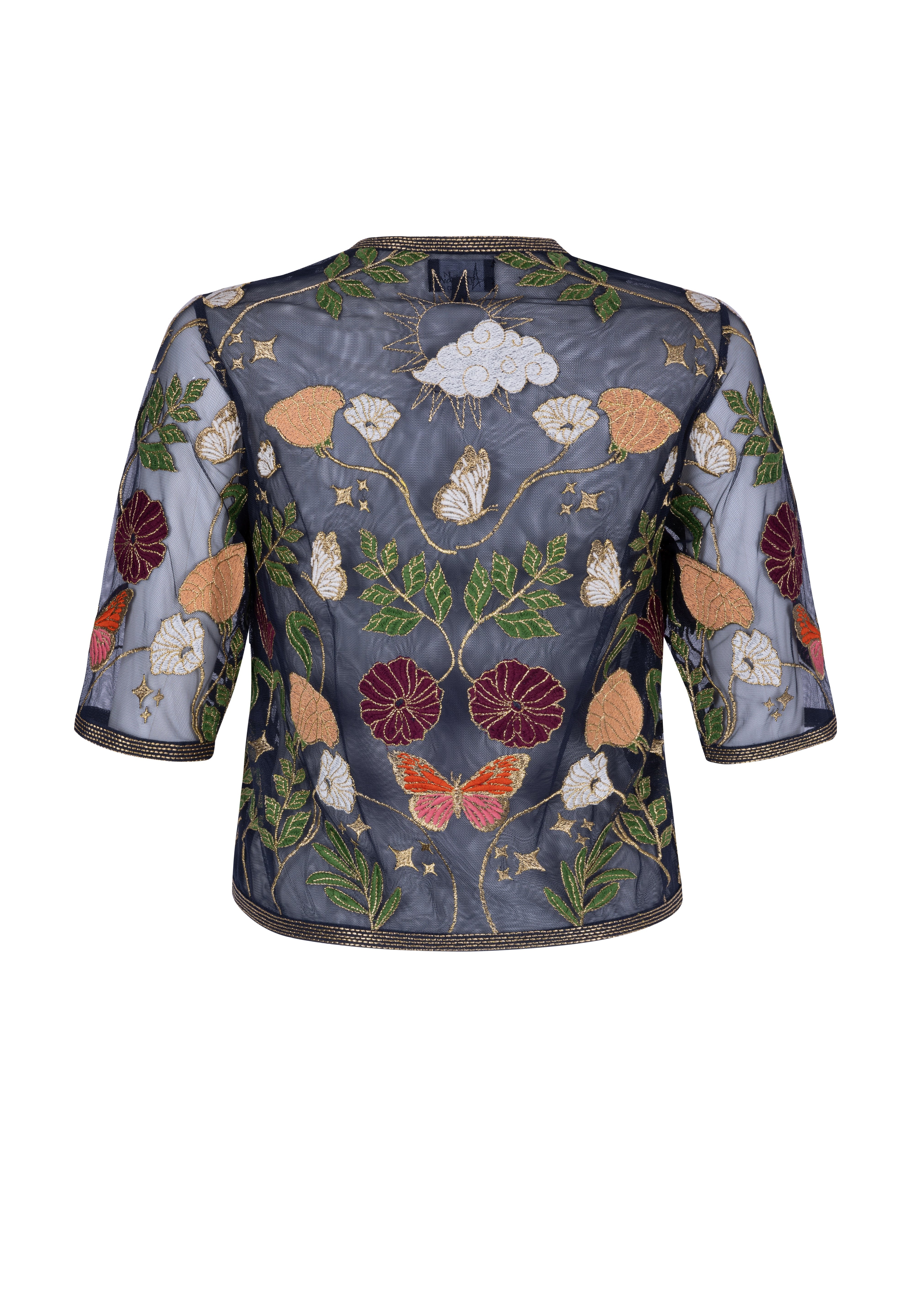 This navy blue Freya Embroidered Sheer Jacket boasts a versatile design, perfect for pairing with dresses or tailored trousers. Its 3/4 length sleeves and metallic gold embroidery add a touch of elegance and sophistication.