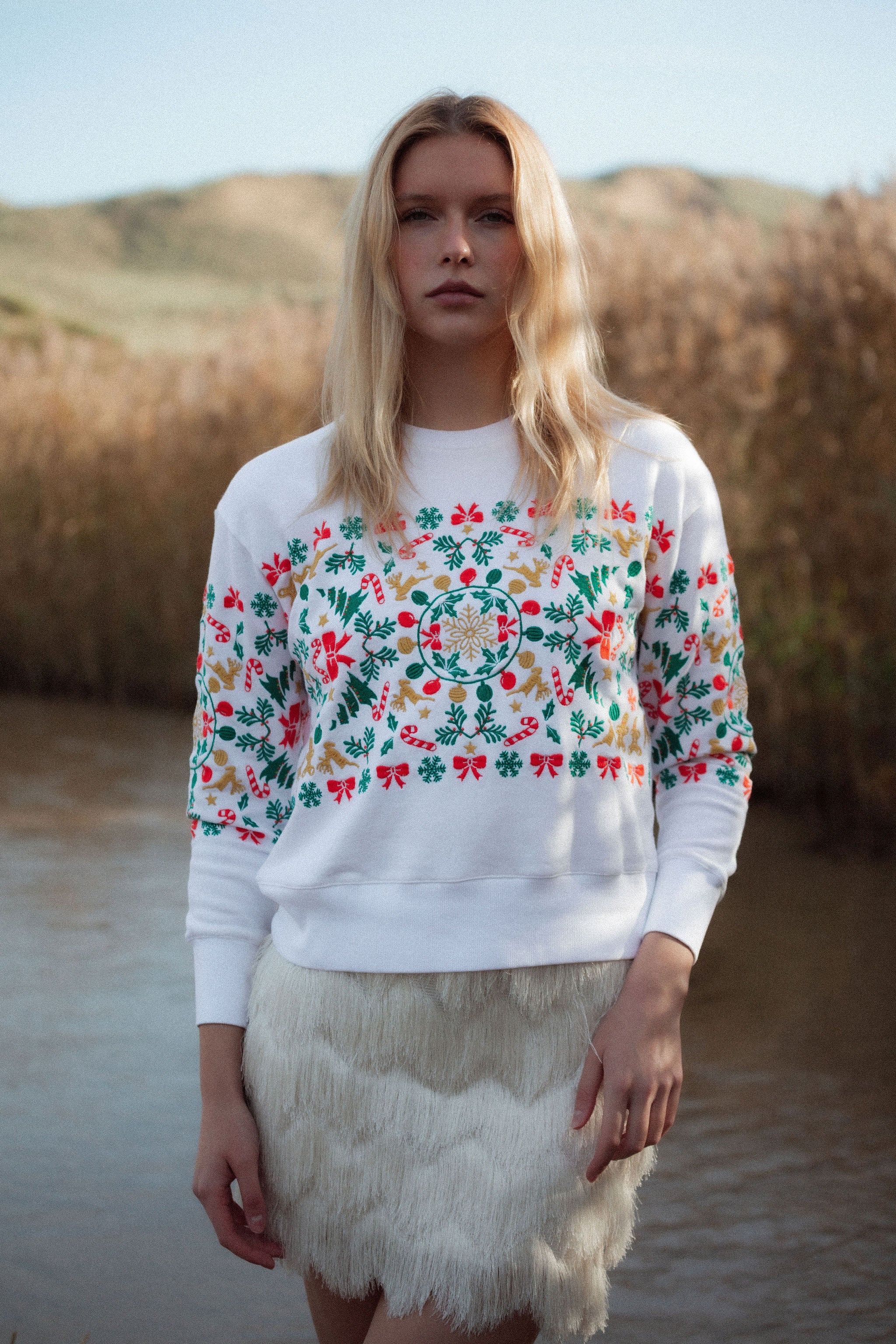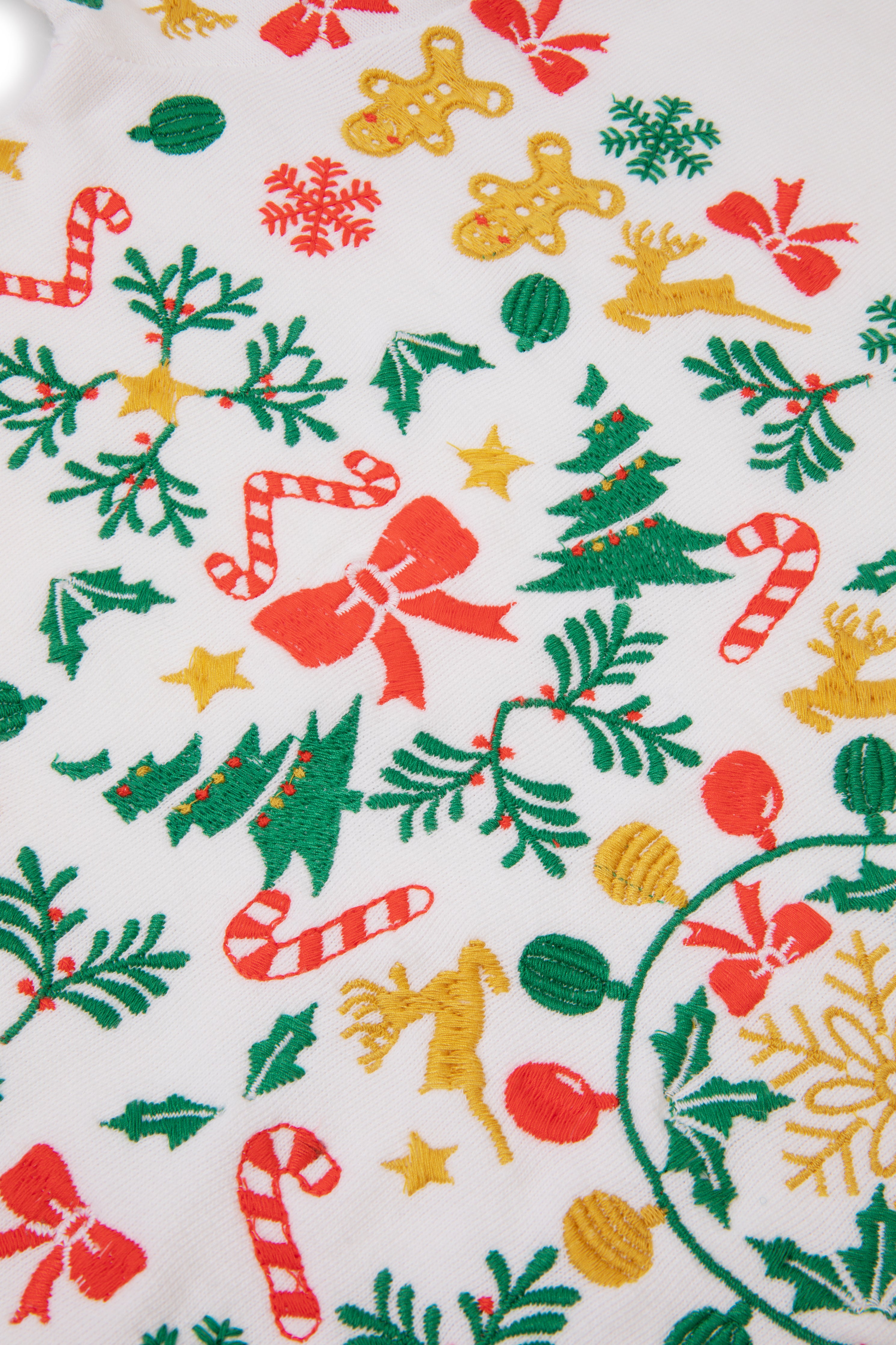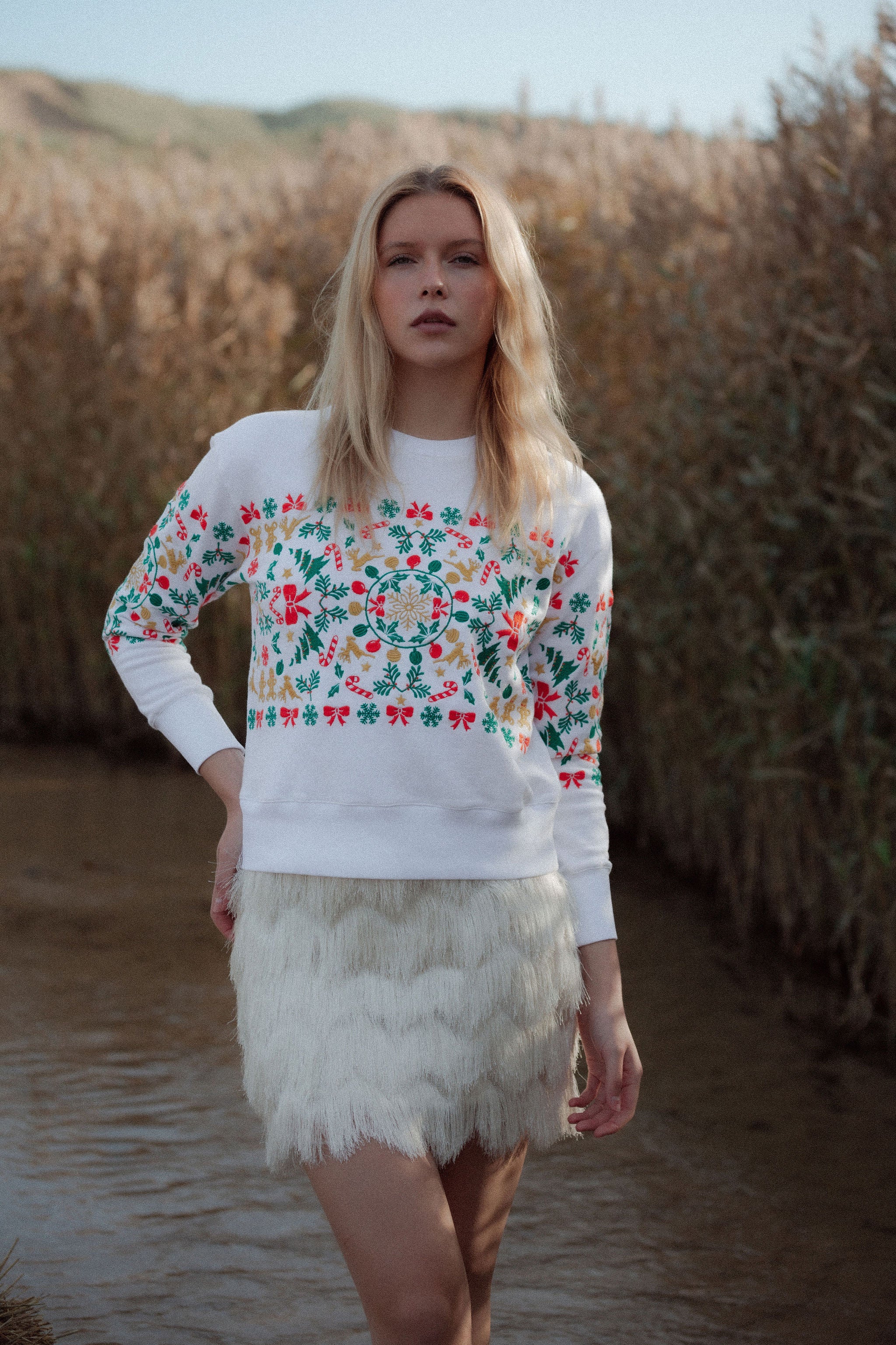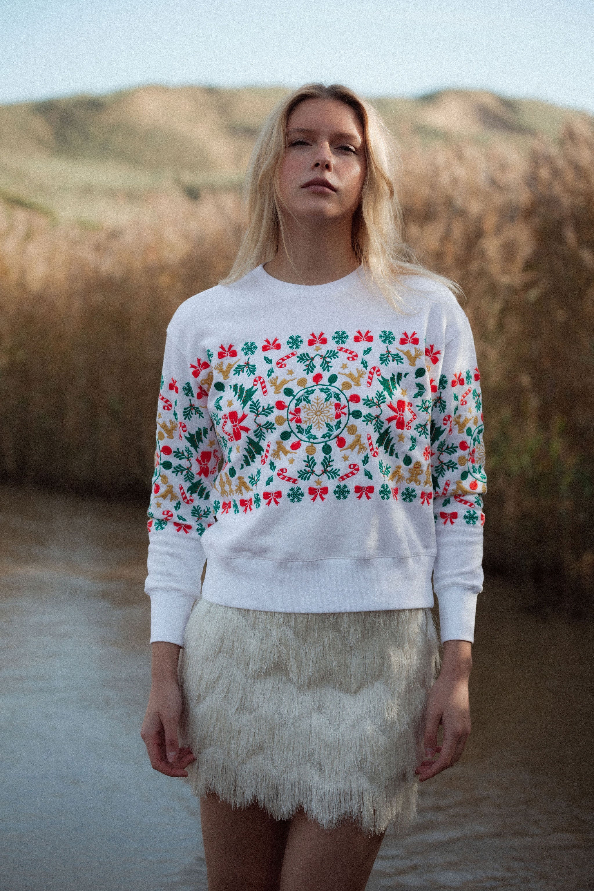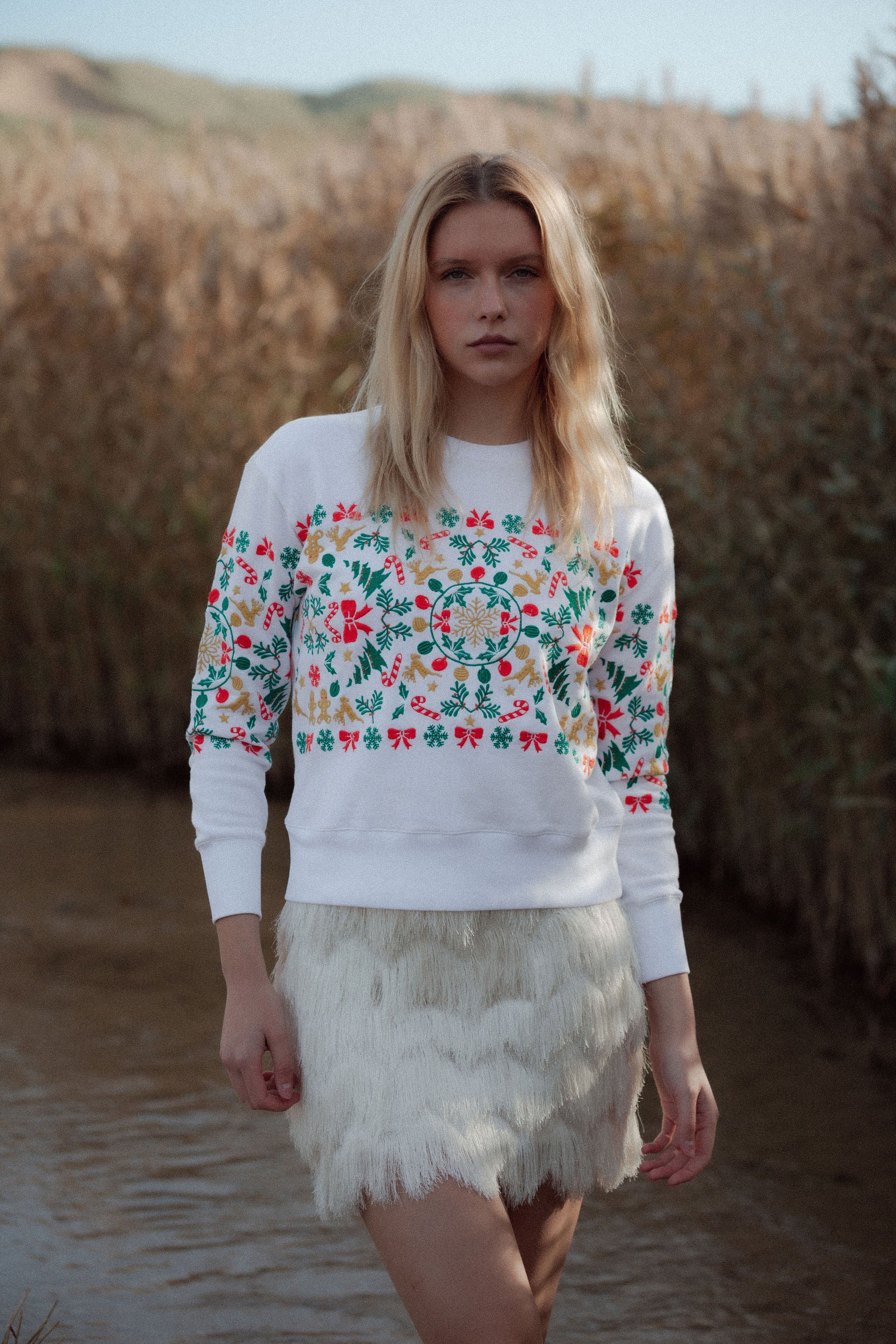 The Holly Jolly Jumper, is one of our fun and festive designs. This has been embroidered onto white organic cotton. Christmas jumpers aren't for all year round but this well made piece is a contemporary design which you'll be able to pull out of your wardrobe every year for years to come!