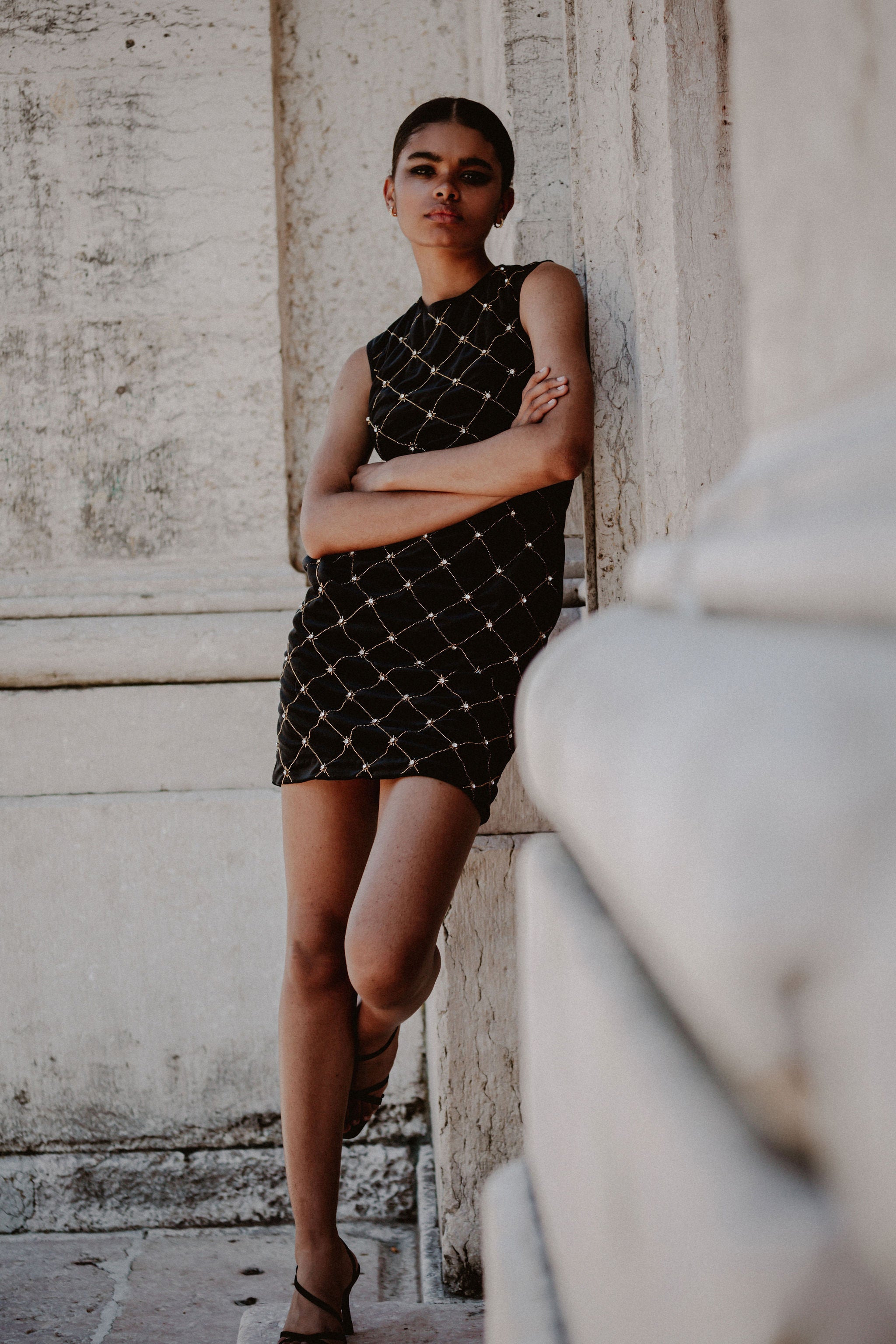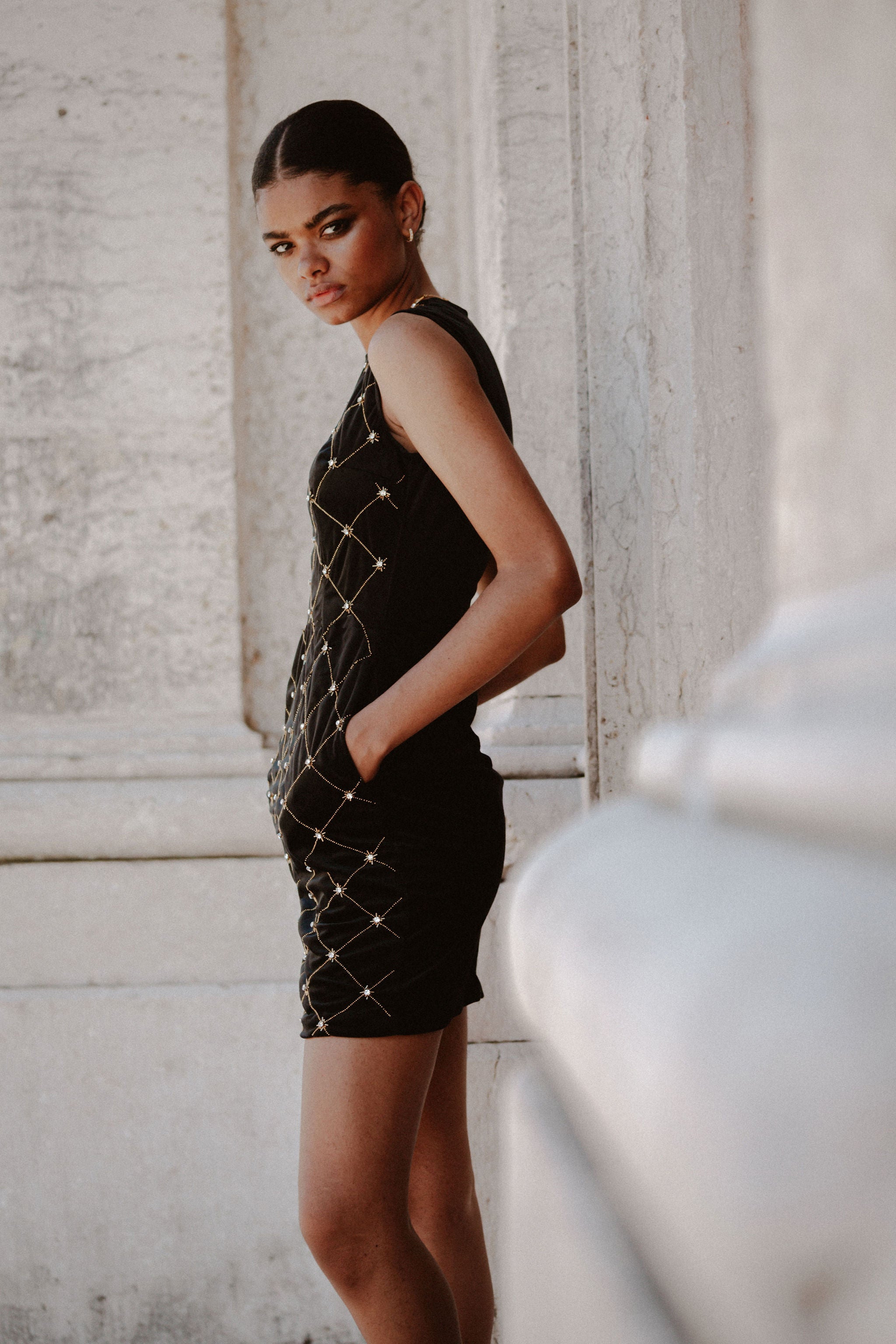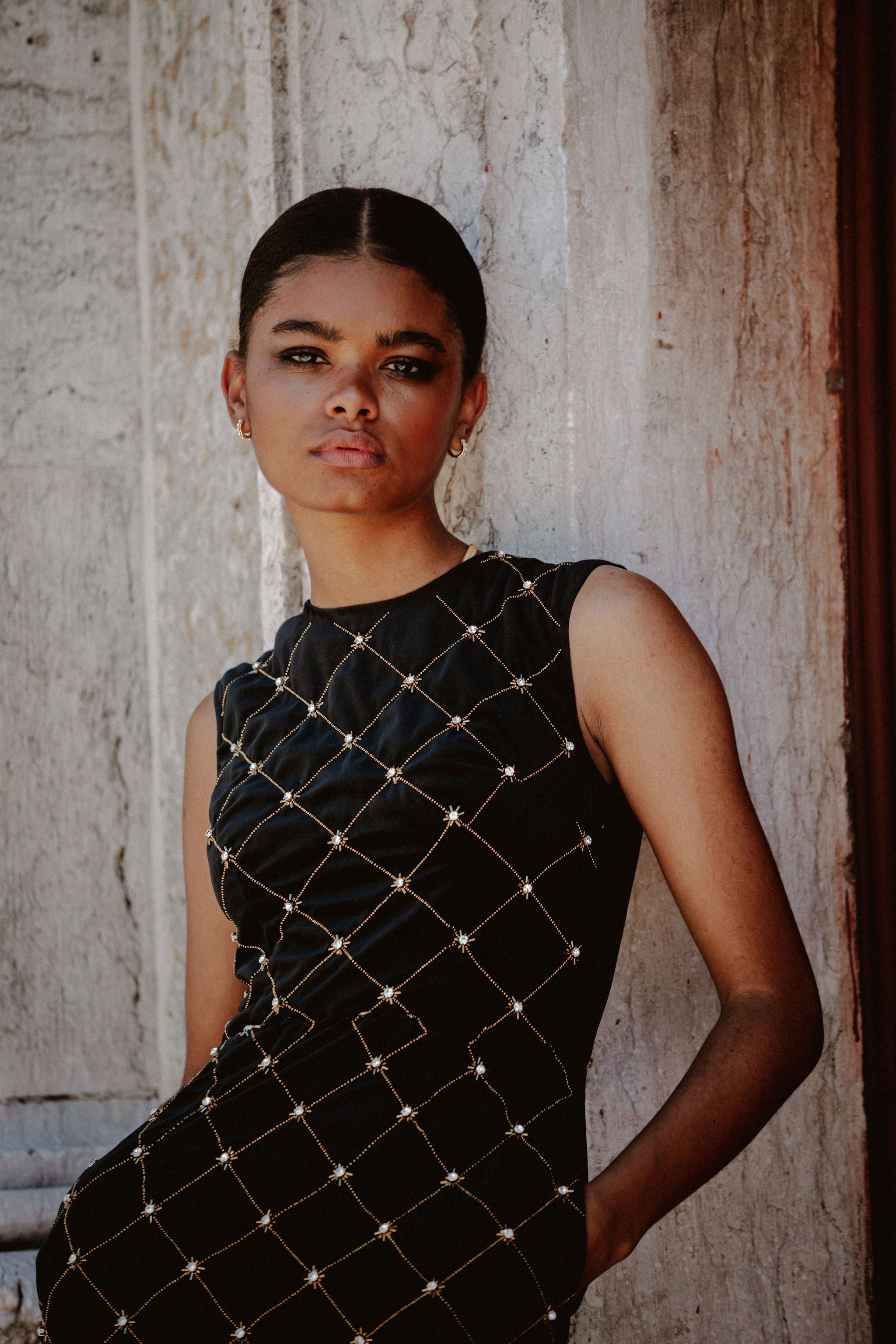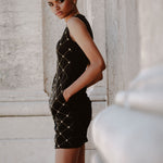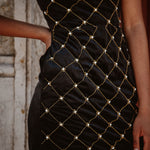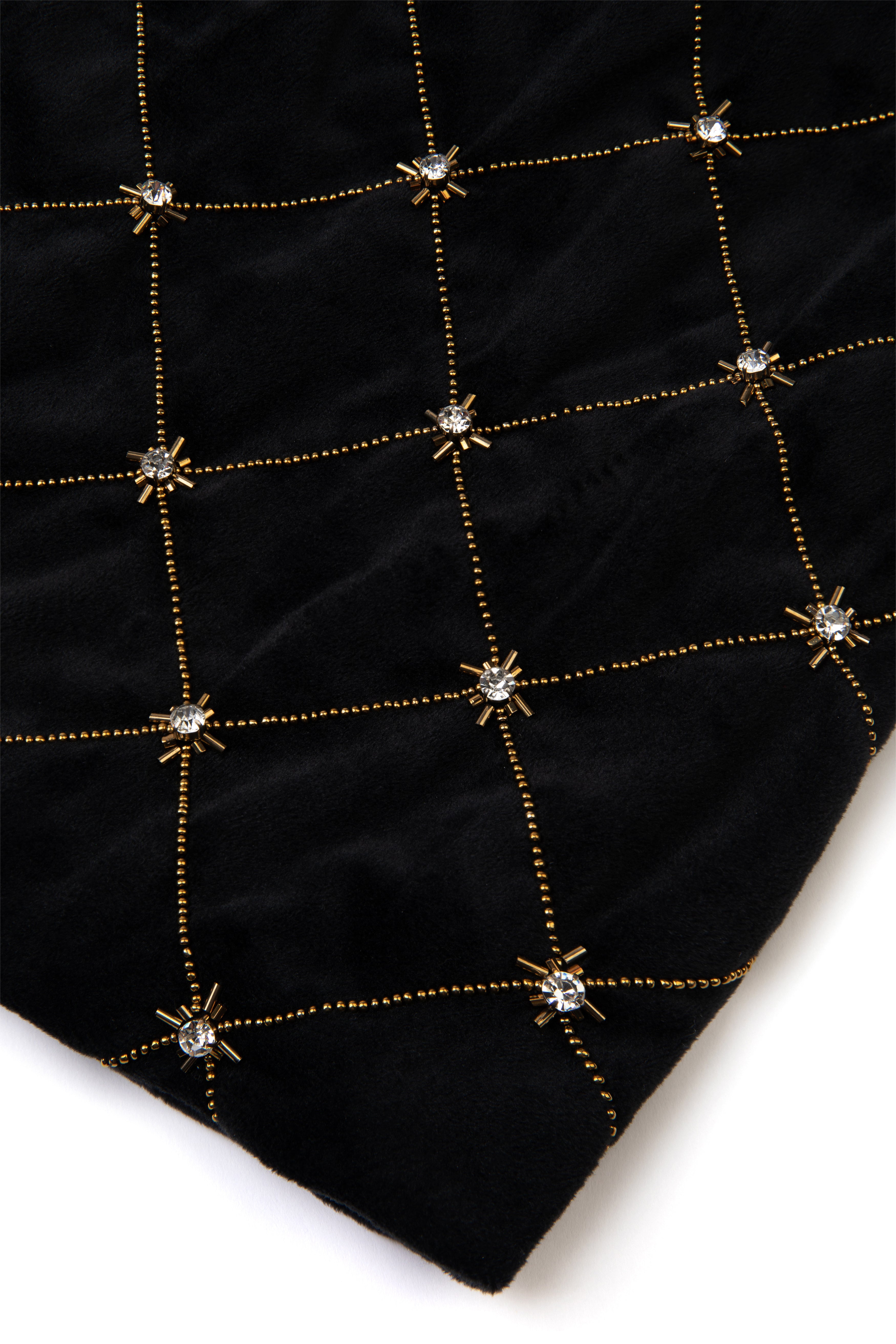 Feel like a star in Madeline, the showstopping velvet fitted dress! Although its sleek silhouette and black velvet material make this evening dress a classic, the addition of sparkly gold beads and embellishments ensures you'll have all eyes on you. Fun and fancy, it's the perfect pick for any special occasion!