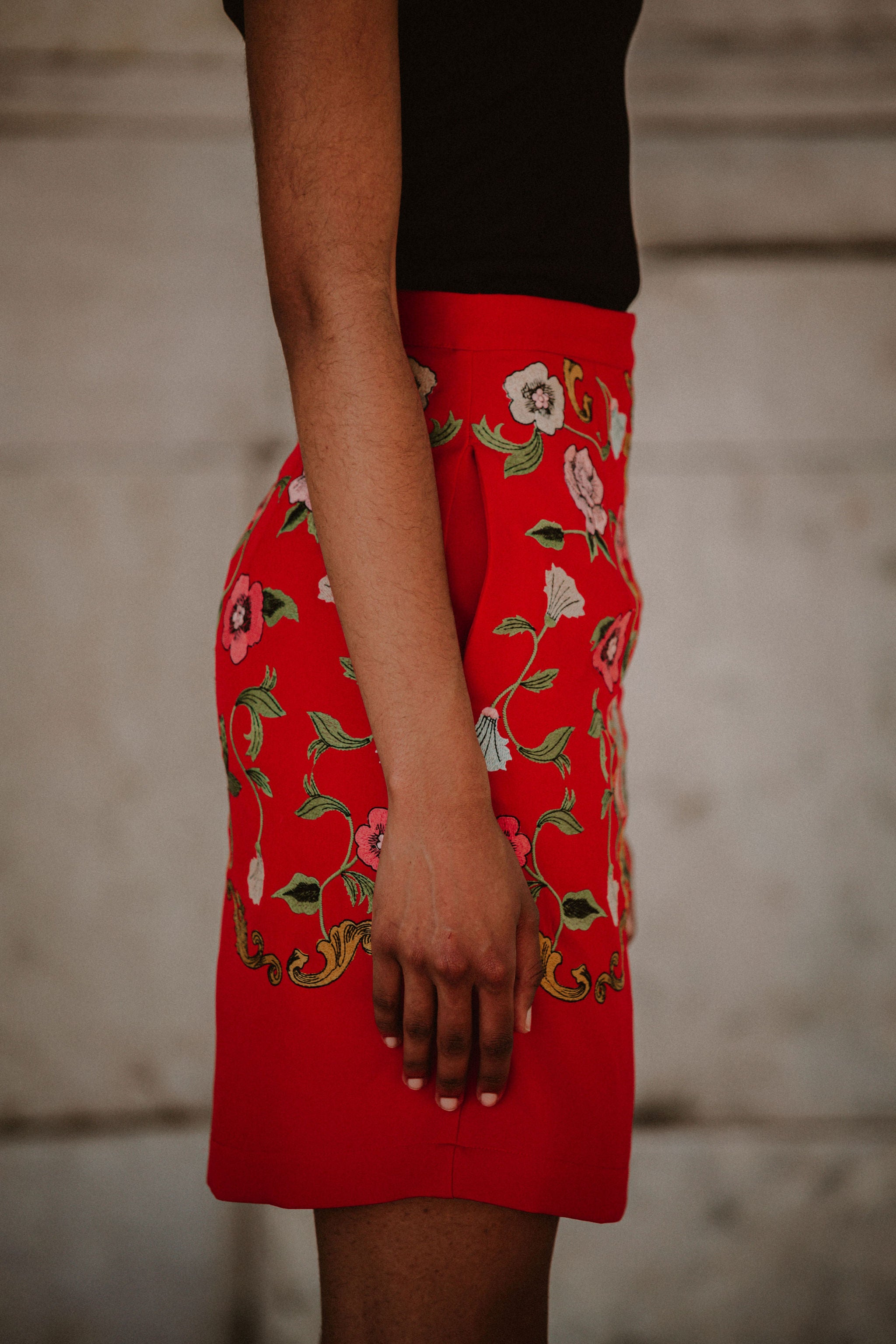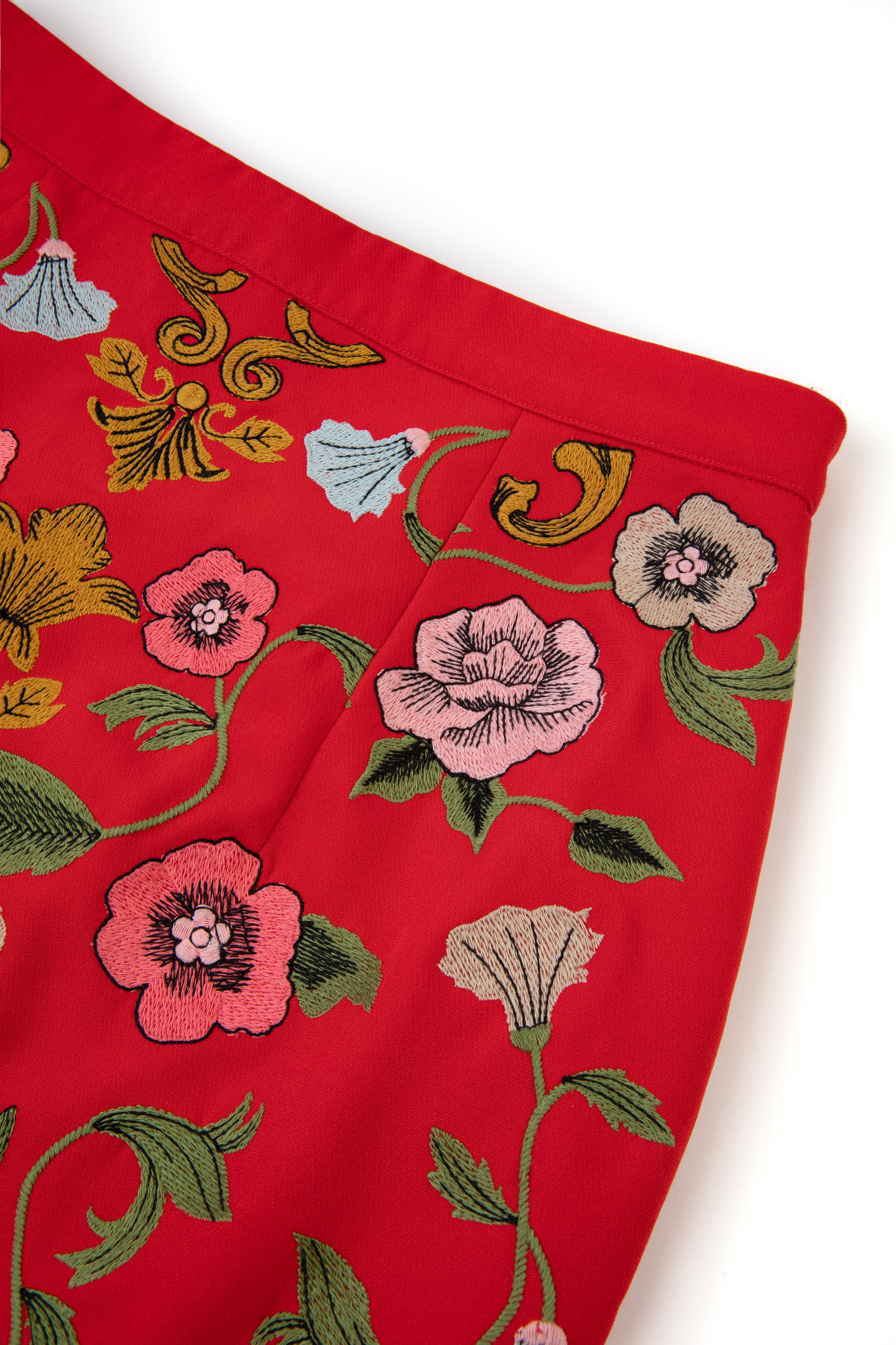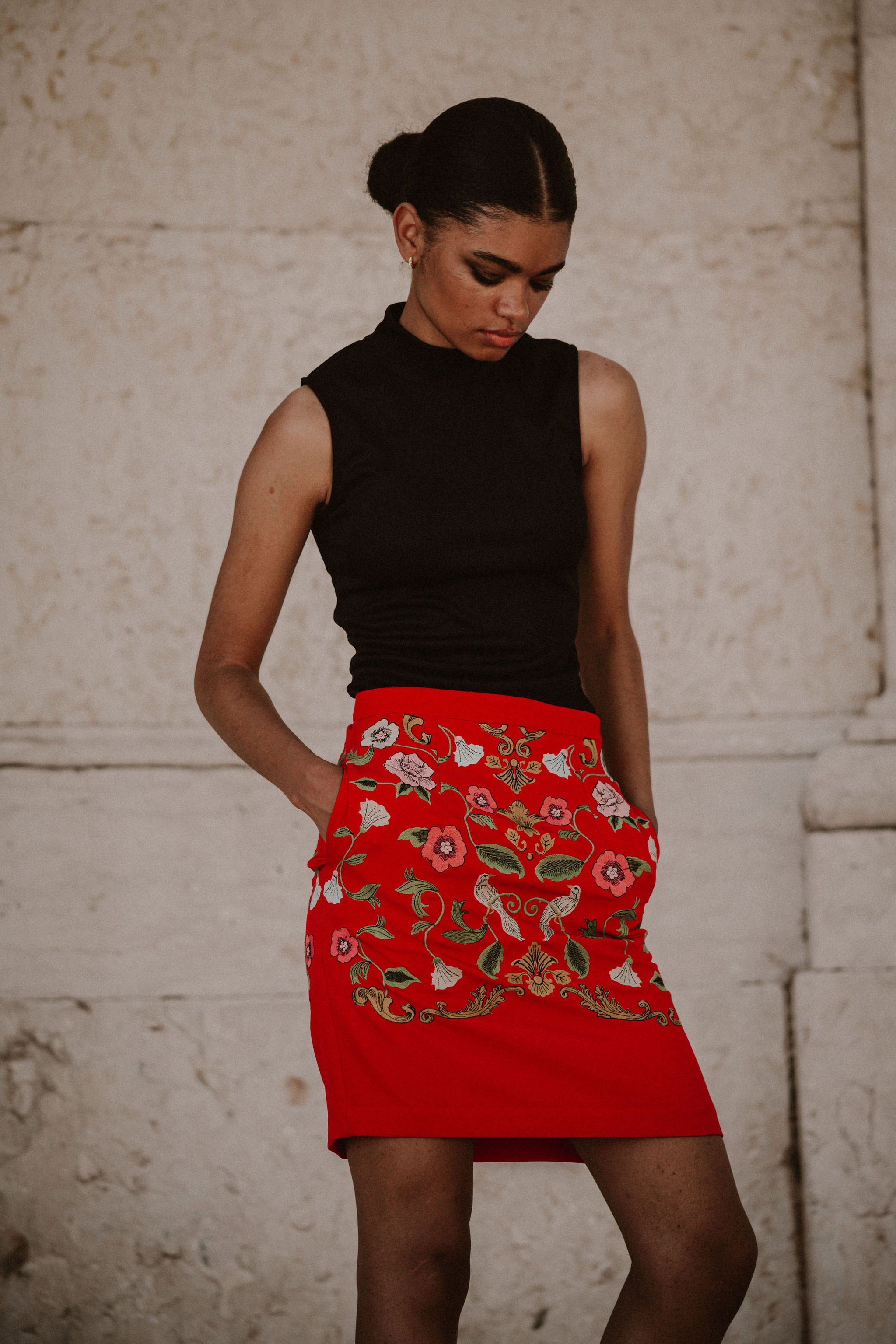 You'll make a statement in the Madeline Embroidered A-Line Skirt! Perfect for any occasion, this daring red skirt features intricate embroidery, making sure you turn heads (for all the right reasons). Flaunt it and strut your stuff!
