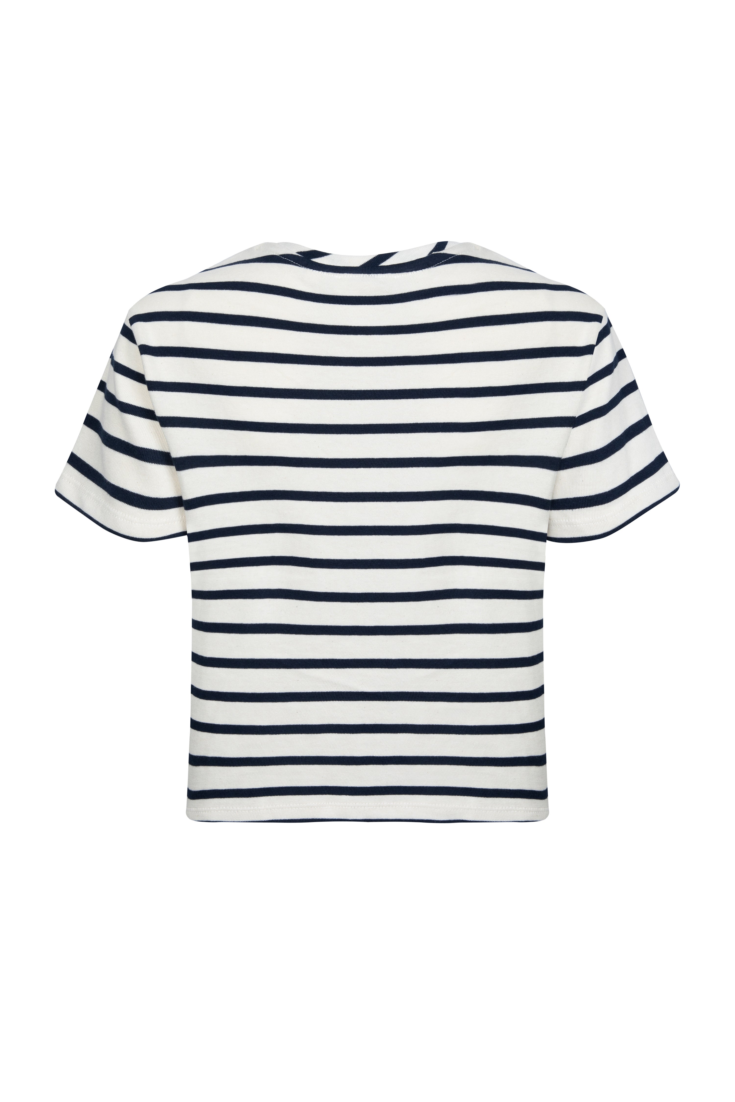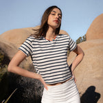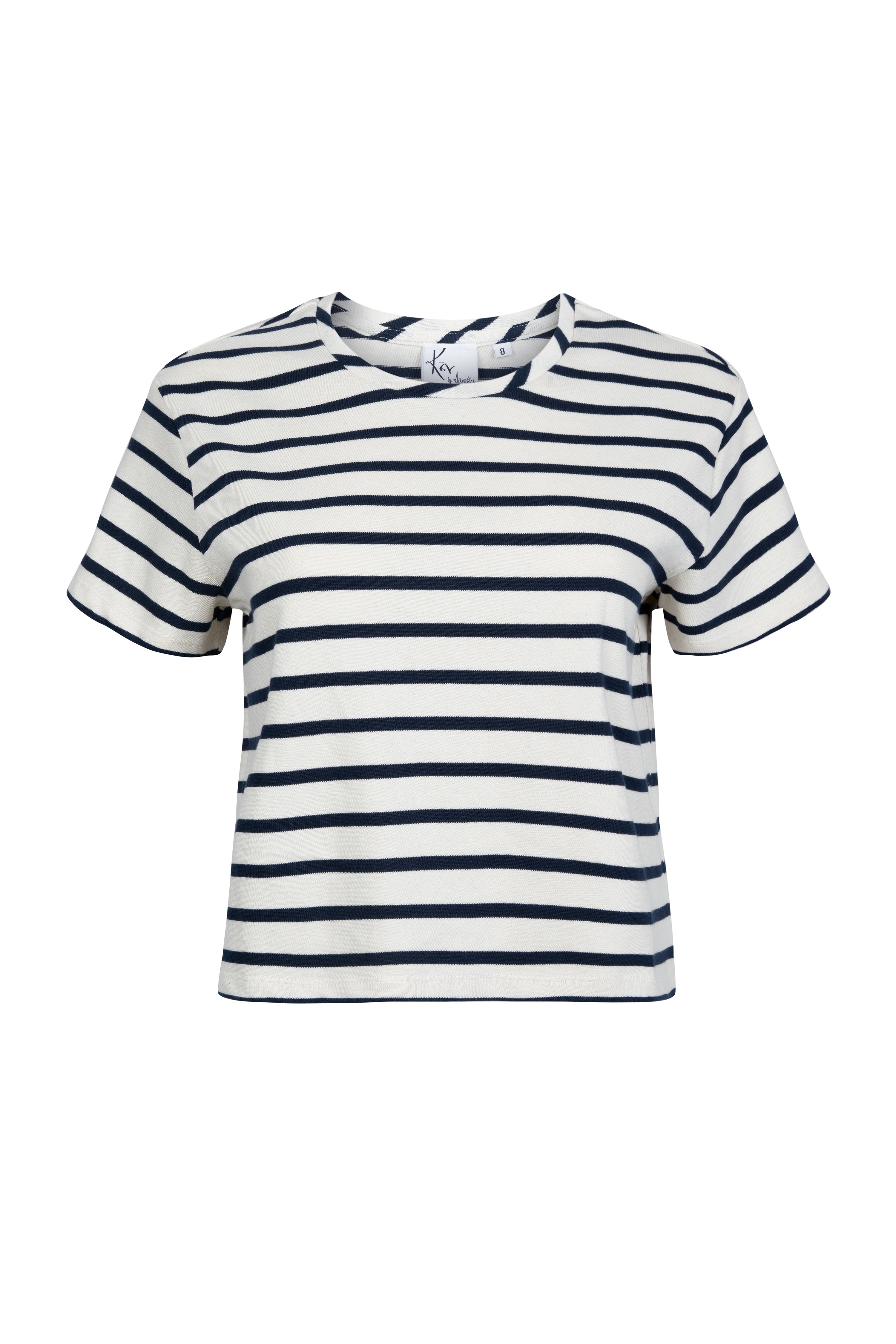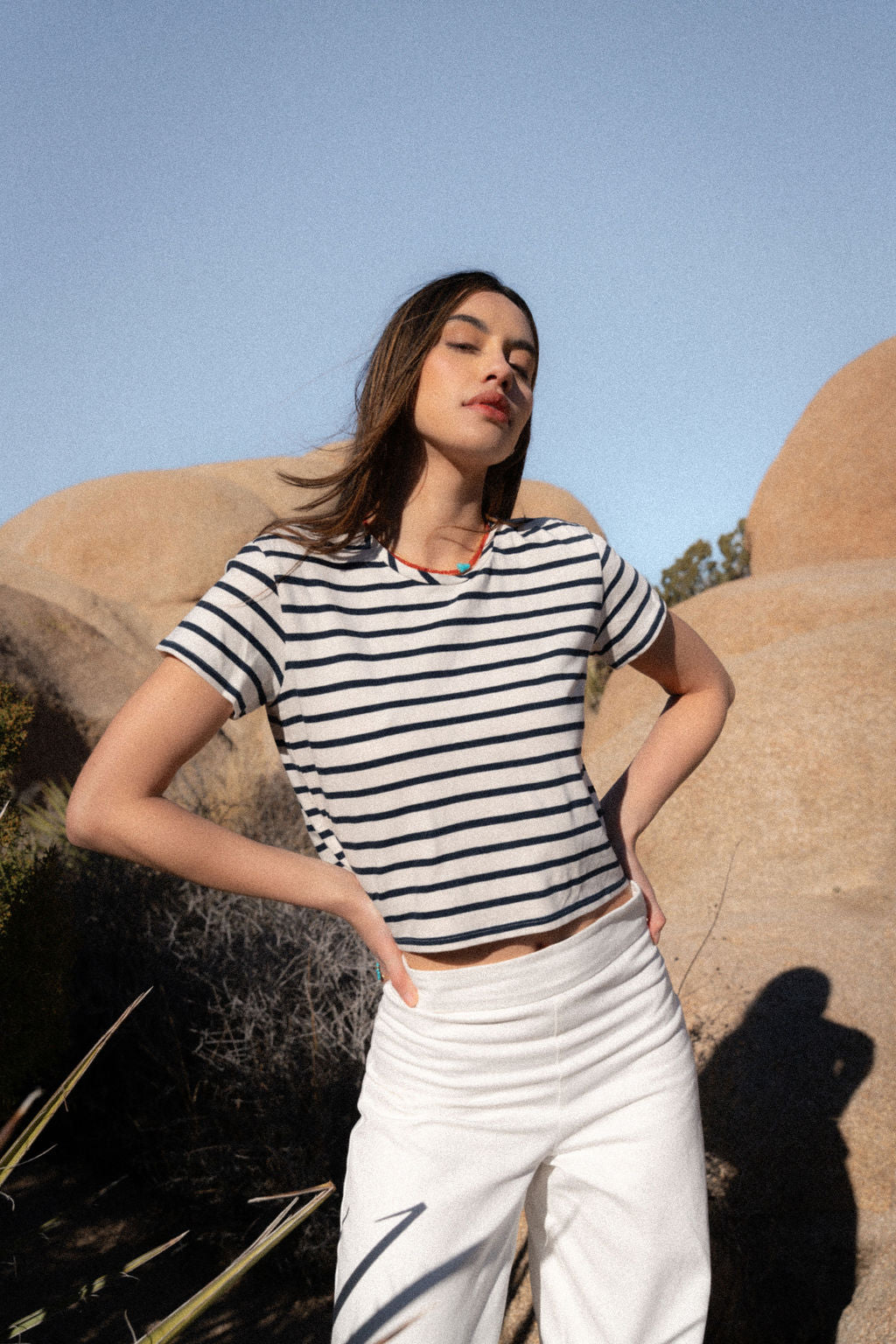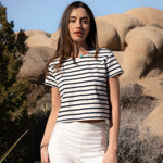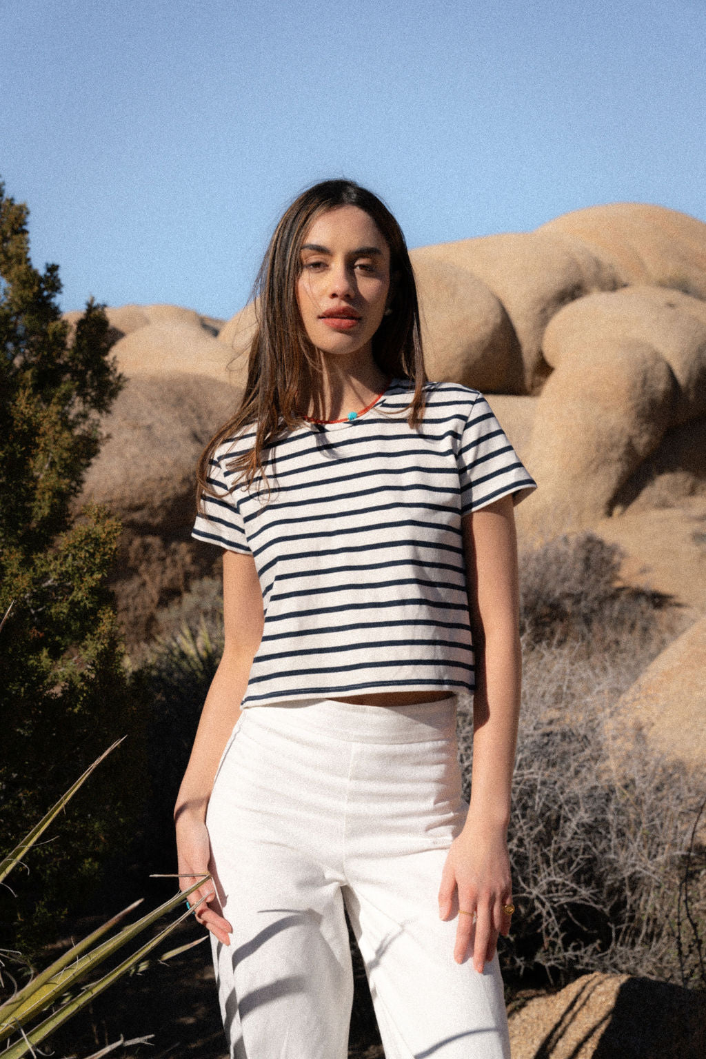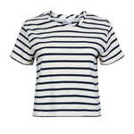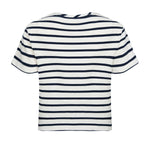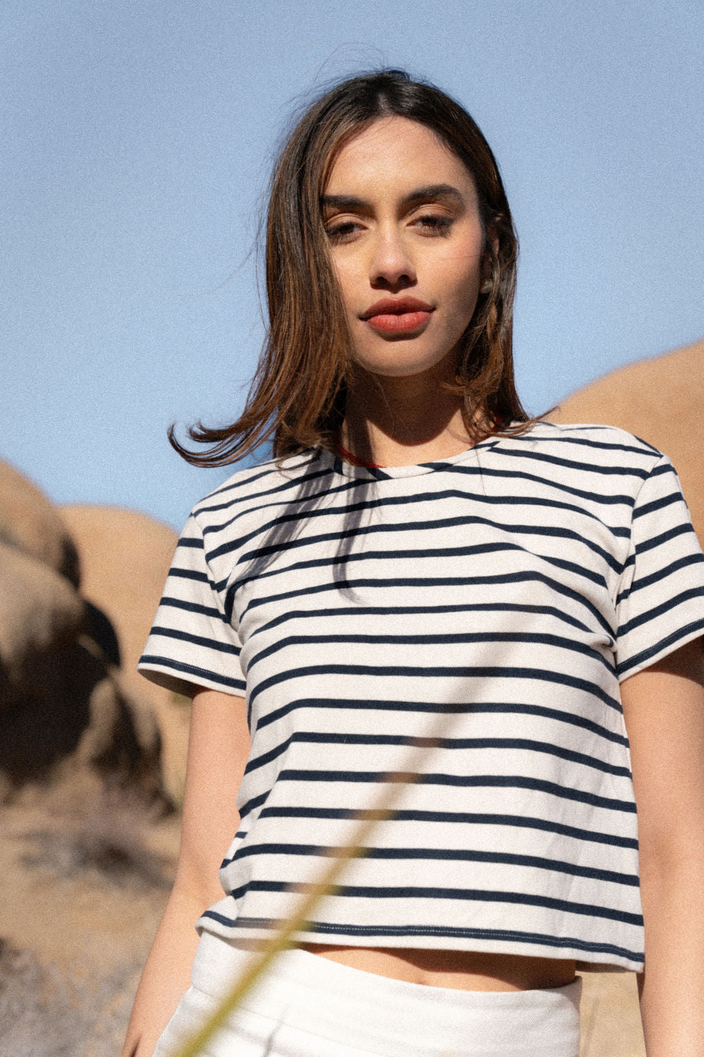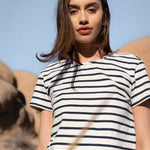 Elevate your casual style with our classic cream and navy blue striped women's t-shirt. Crafted from high-quality deadstock fabric, this t-shirt not only looks good but also contributes to reducing fashion waste. This t-shirt is a versatile wardrobe essential that effortlessly transitions from day to night. The high-quality fabric ensures a soft and comfortable feel against your skin. Pair it with your favourite jeans or a high-waisted skirt for an effortlessly chic look.
