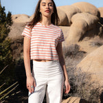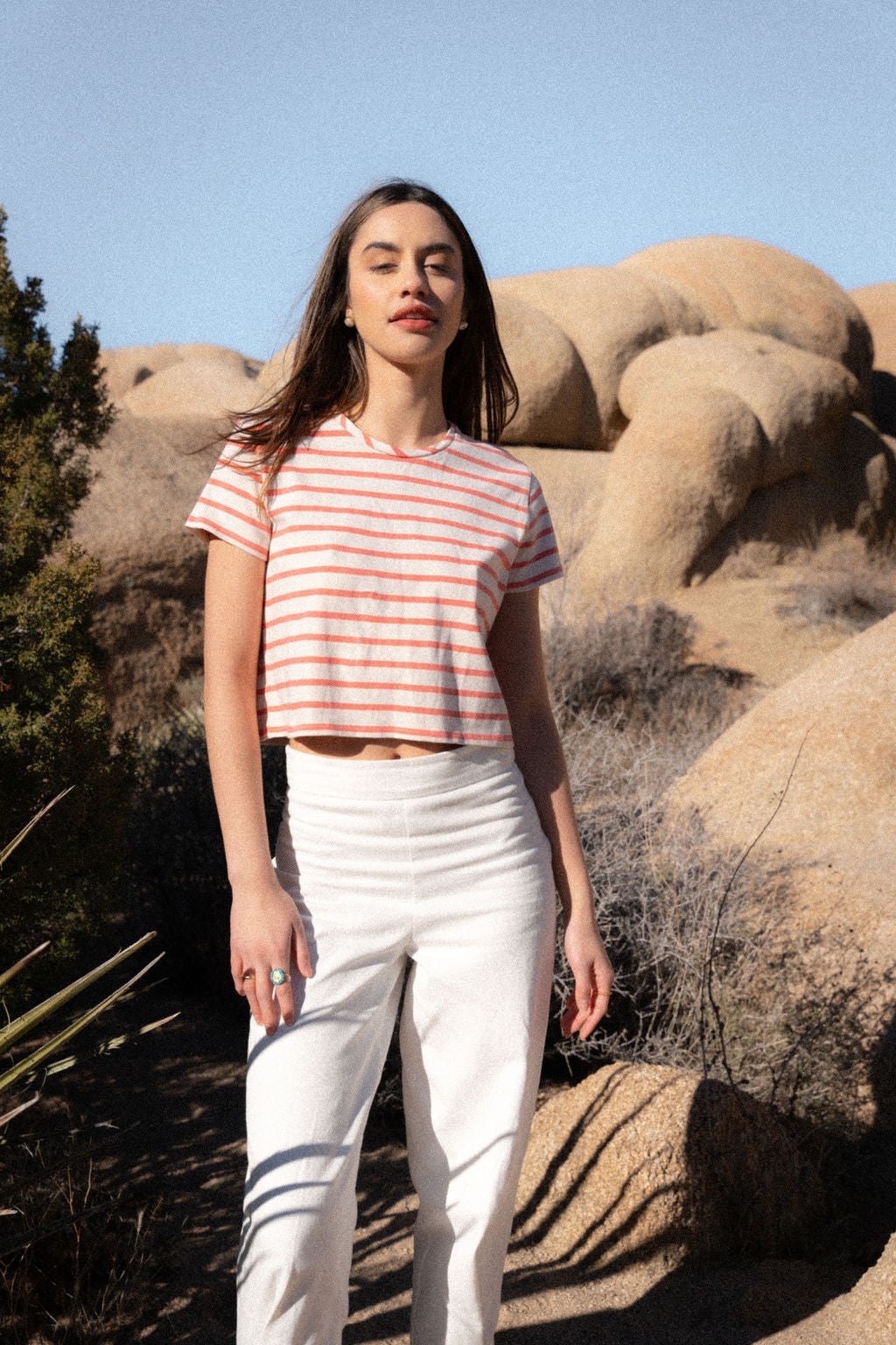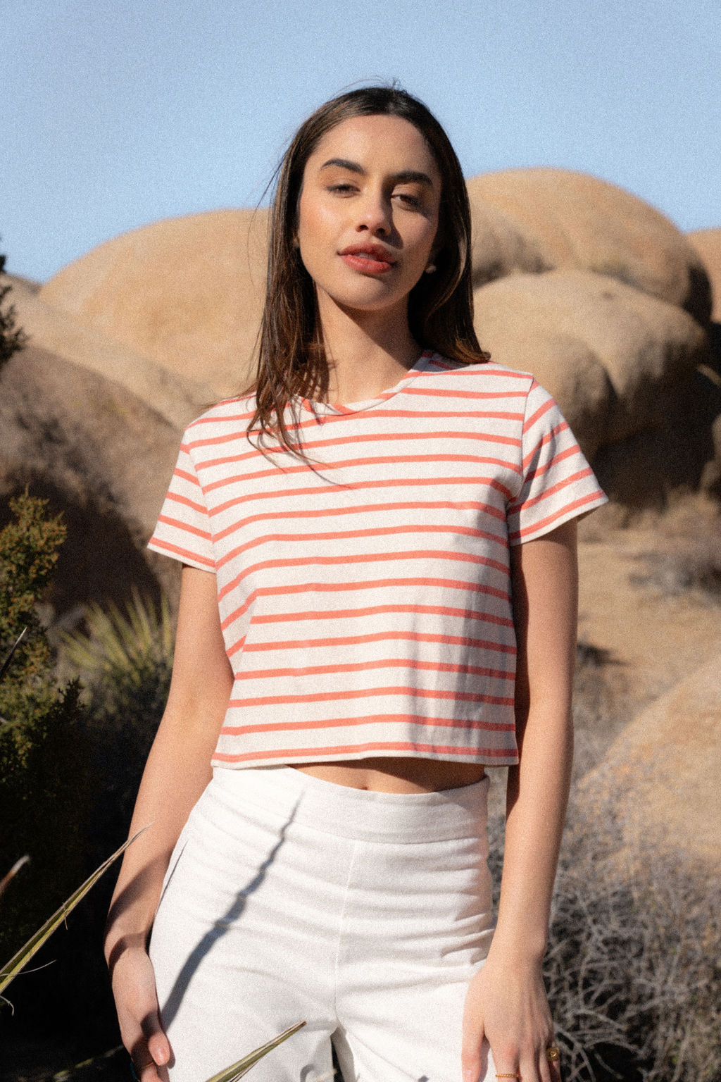 Introducing The Box Pink Striped T-Shirt – a perfect blend of comfort, style, and sustainability. Crafted from high-quality deadstock fabric, this t-shirt not only looks good but also contributes to reducing fashion waste. With a trendy boxy fit and a waist-cropped silhouette, this shirt effortlessly combines fashion-forward aesthetics with casual comfort. The relaxed fit ensures breathability, making it an ideal choice for everyday wear.