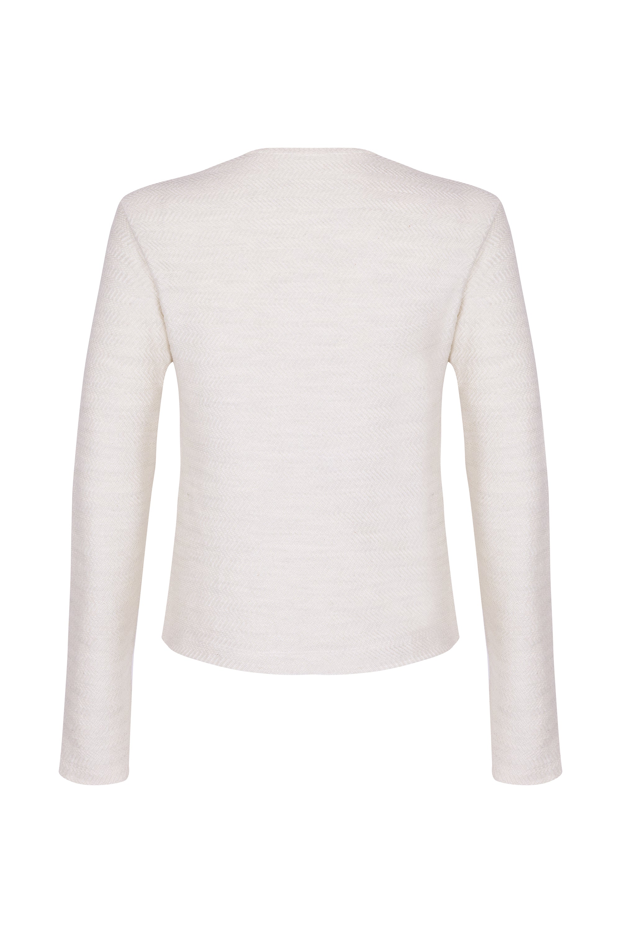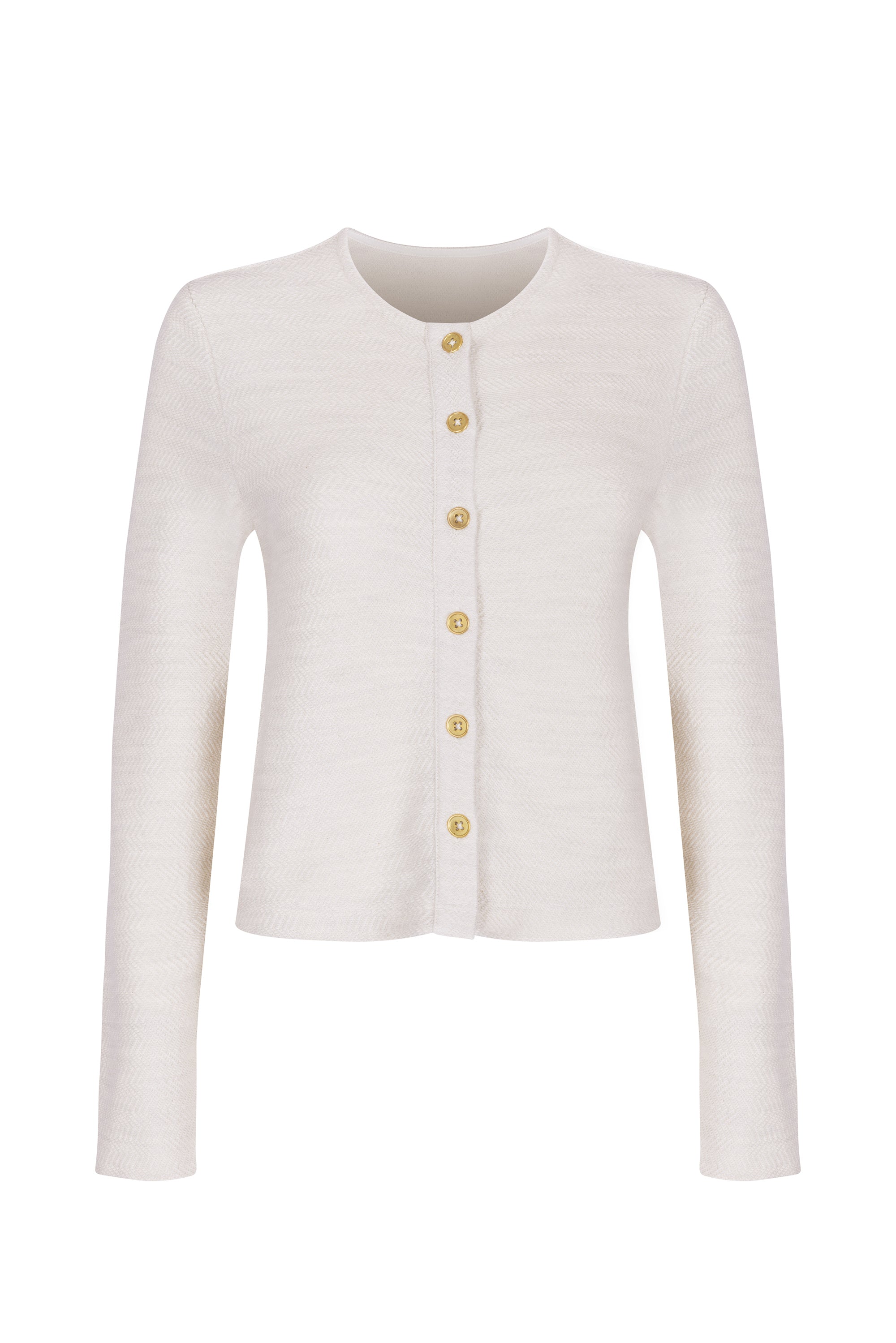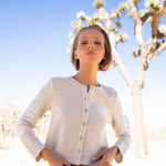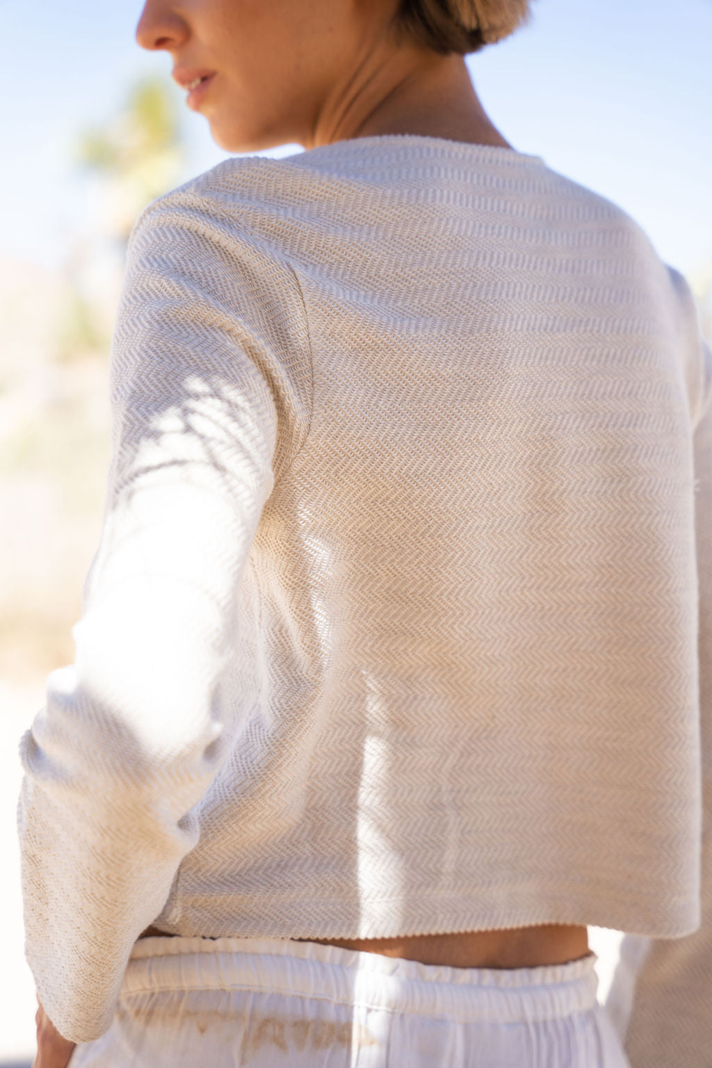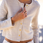 Made from luxurious cream textured fabric and featuring long sleeves and gold buttons, this classic and versatile style is perfect for any occasion. Plus, it's sustainably made using deadstock fabrics, making it a guilt-free addition to your wardrobe that you can wear for years to come.