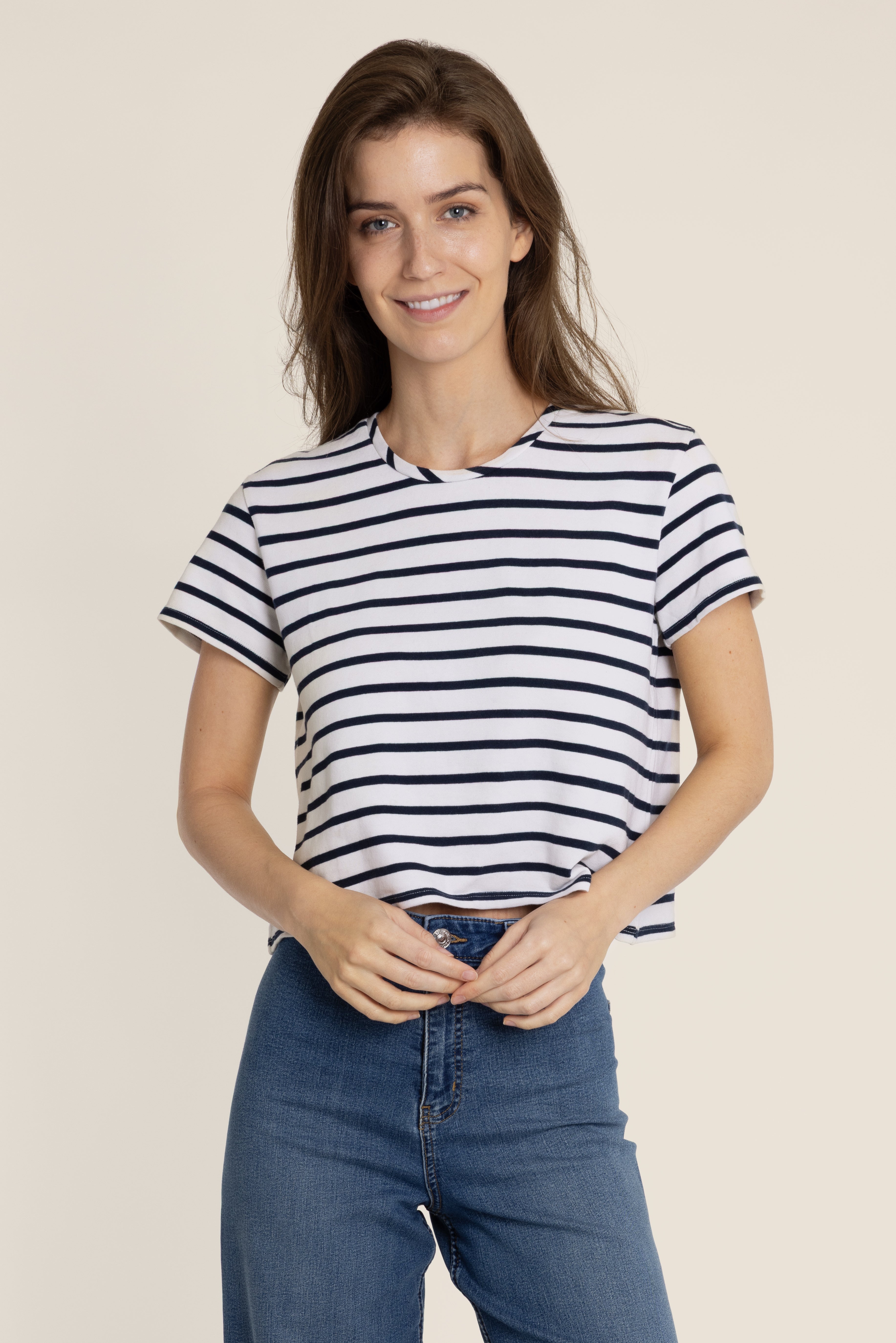 Elevate your casual style with our classic cream and navy blue striped women's t-shirt. Crafted from high-quality deadstock fabric, this t-shirt not only looks good but also contributes to reducing fashion waste. This t-shirt is a versatile wardrobe essential that effortlessly transitions from day to night. The high-quality fabric ensures a soft and comfortable feel against your skin. Pair it with your favourite jeans or a high-waisted skirt for an effortlessly chic look.