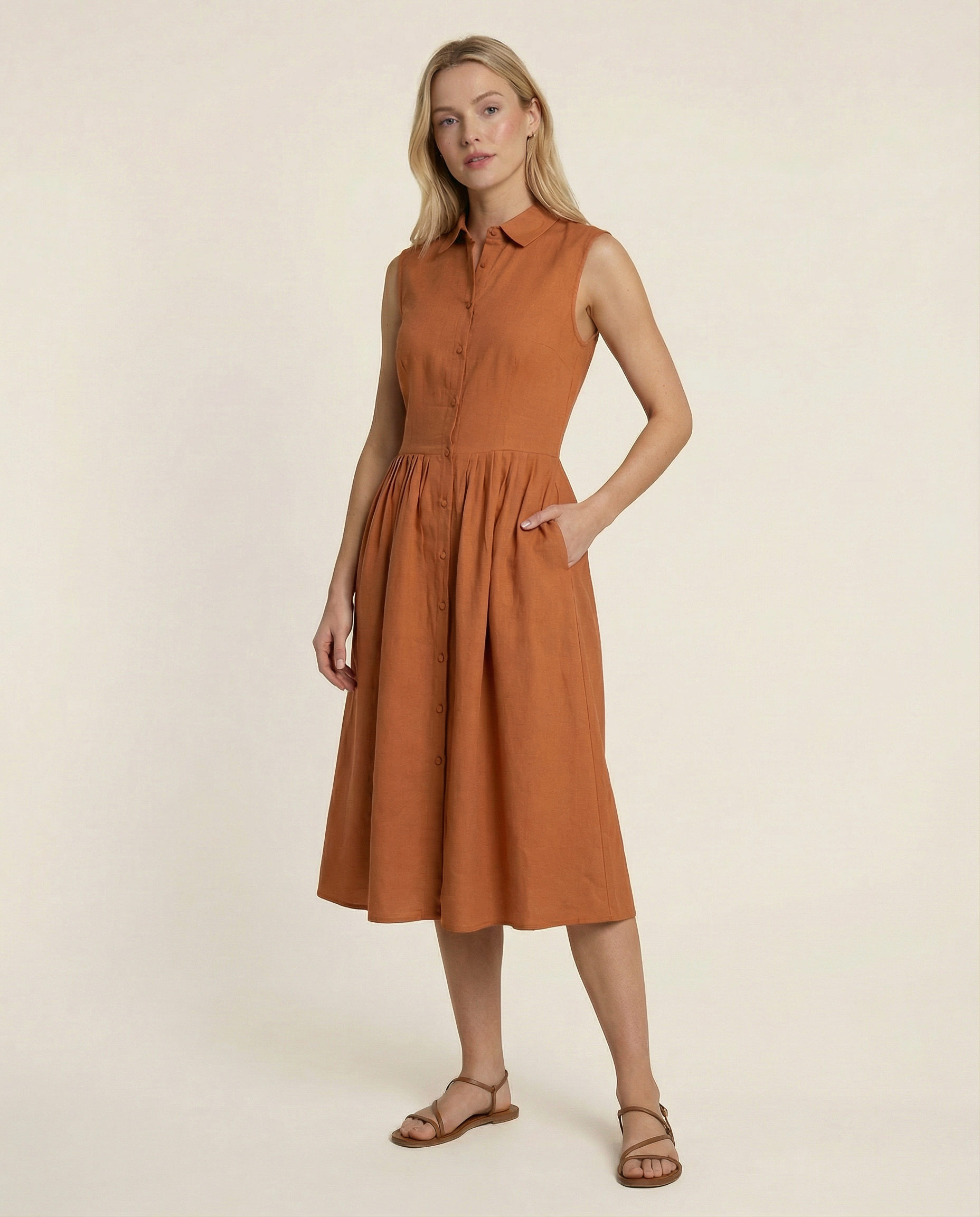 Introducing our best-selling Kōr Shirt Dress in Terracotta. Made from high-quality European flax certified linen and cotton, this feminine dress features a flared skirt and convenient pockets. Hidden hooks between buttons along the bodice provide a secure fit. Stay stylish and comfortable all day long.