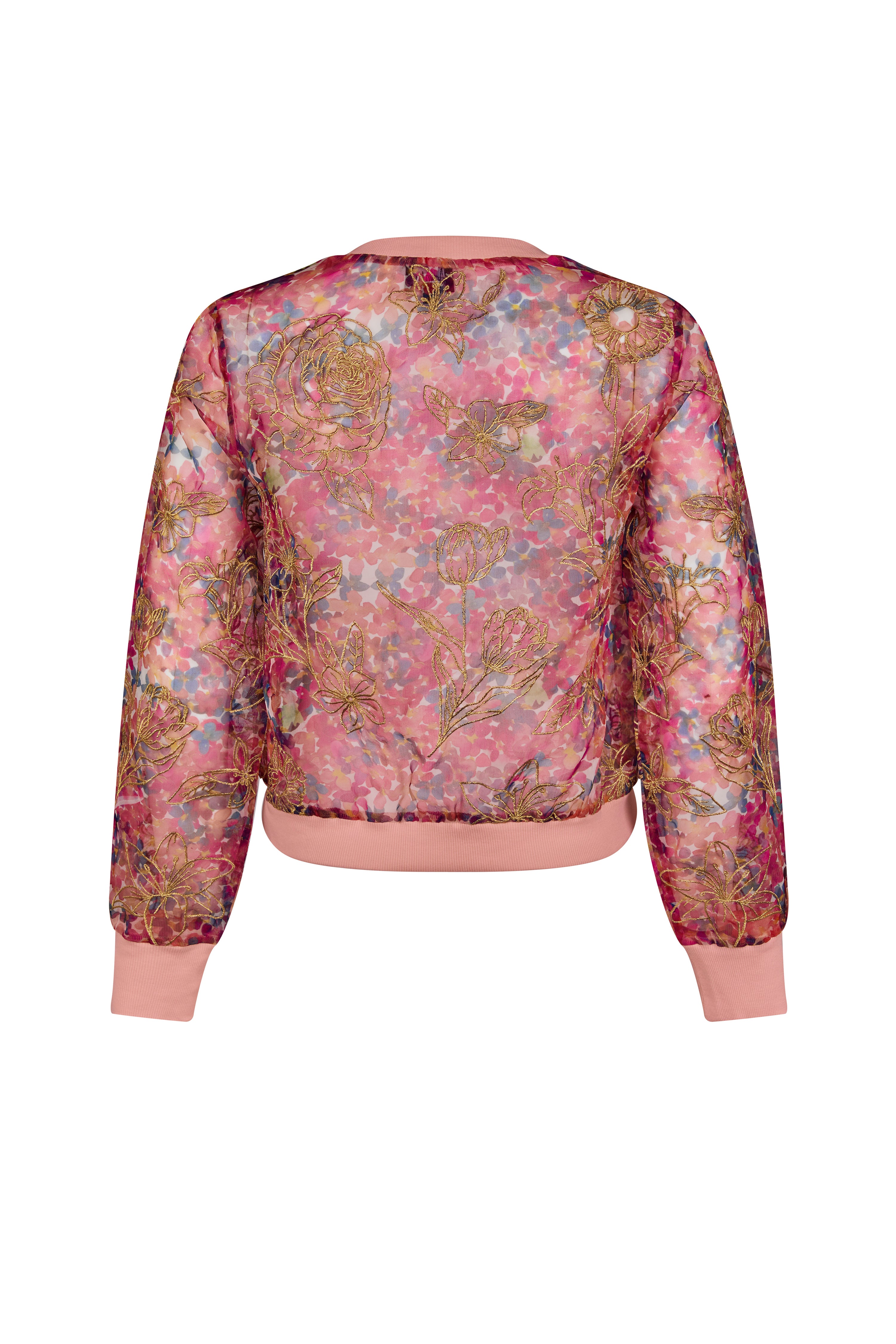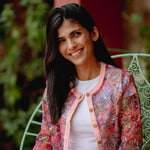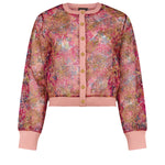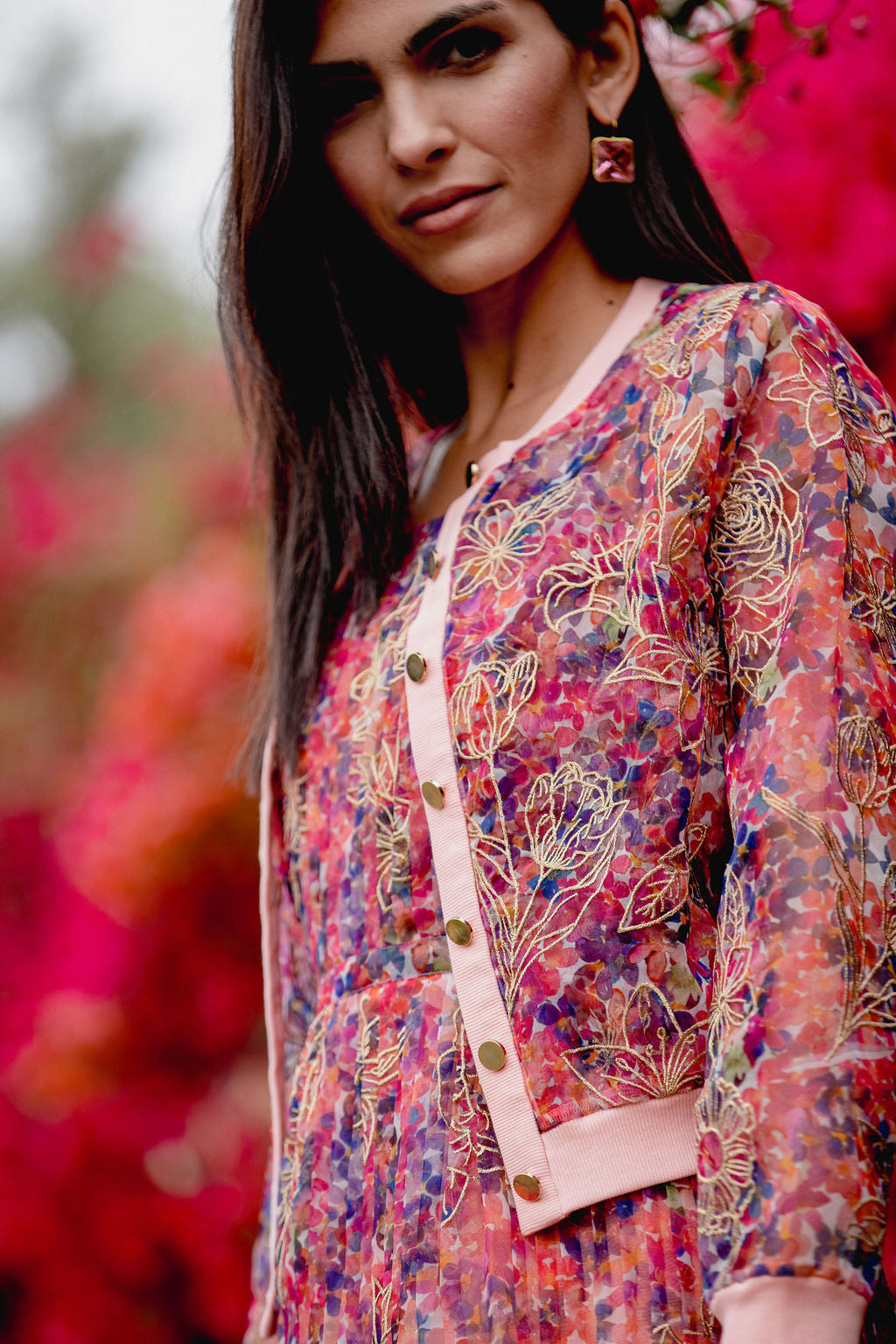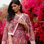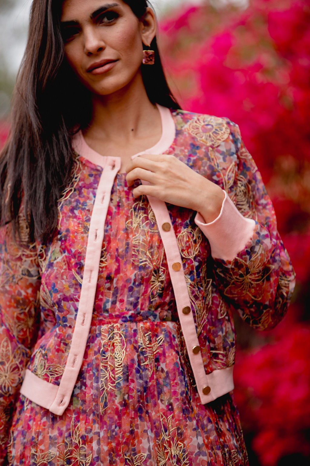 This play on a classic cardigan, made in a sheer fabric, boasts a delicate floral print, enhanced with gold line embroidery detailing. The pale pink border adds a touch of femininity, making it the perfect addition to any sophisticated outfit.