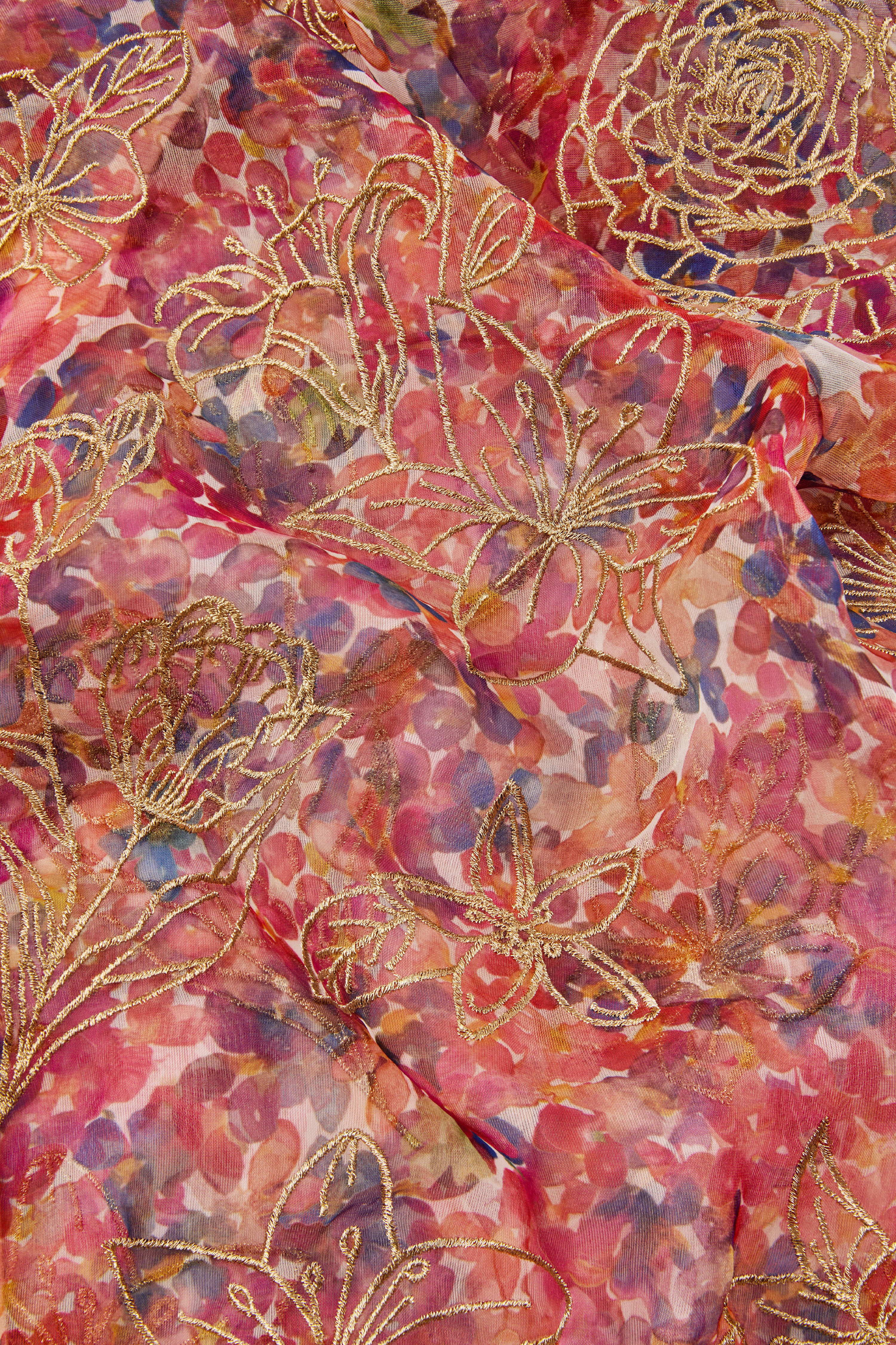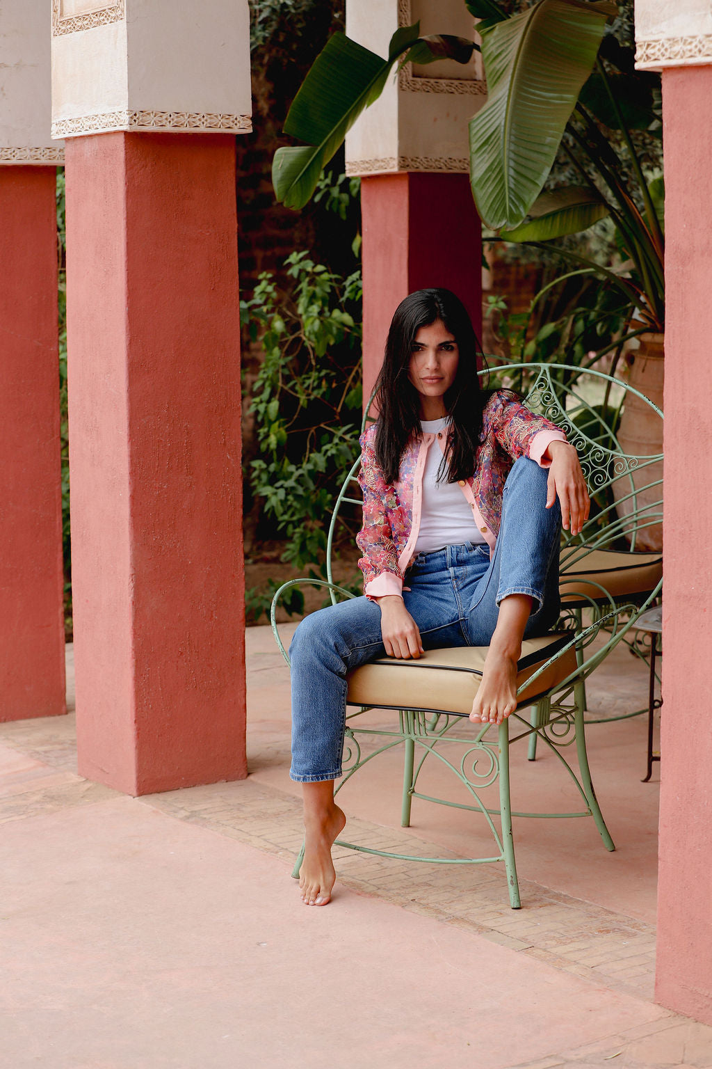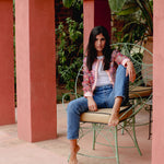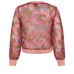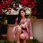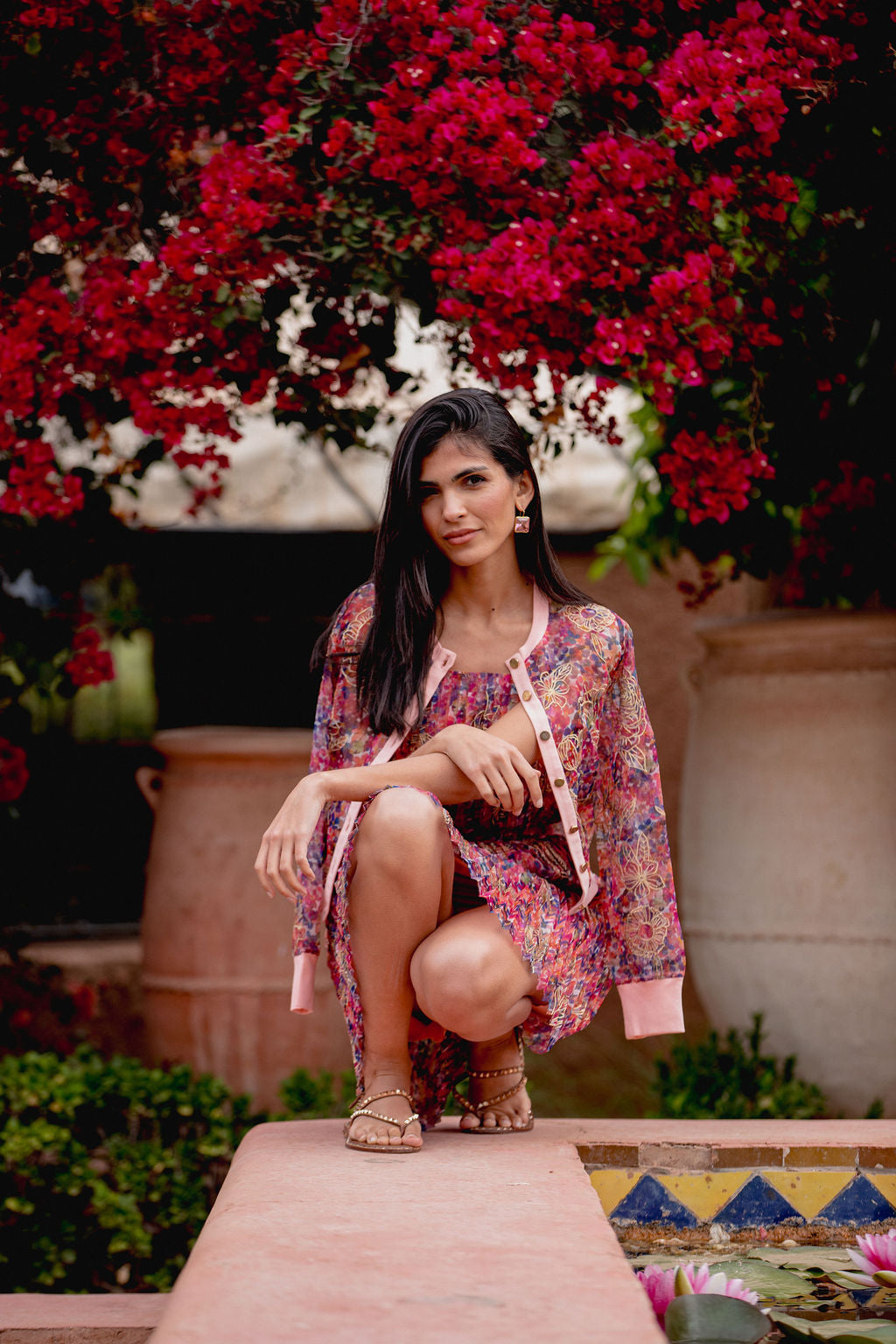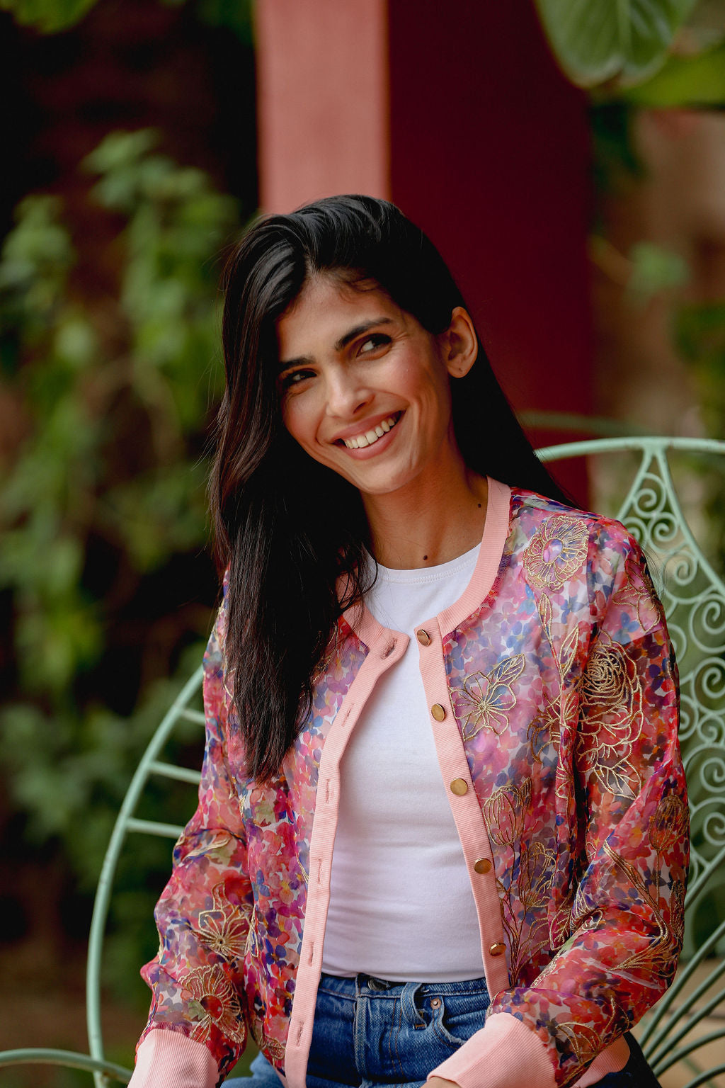 This play on a classic cardigan, made in a sheer fabric, boasts a delicate floral print, enhanced with gold line embroidery detailing. The pale pink border adds a touch of femininity, making it the perfect addition to any sophisticated outfit.