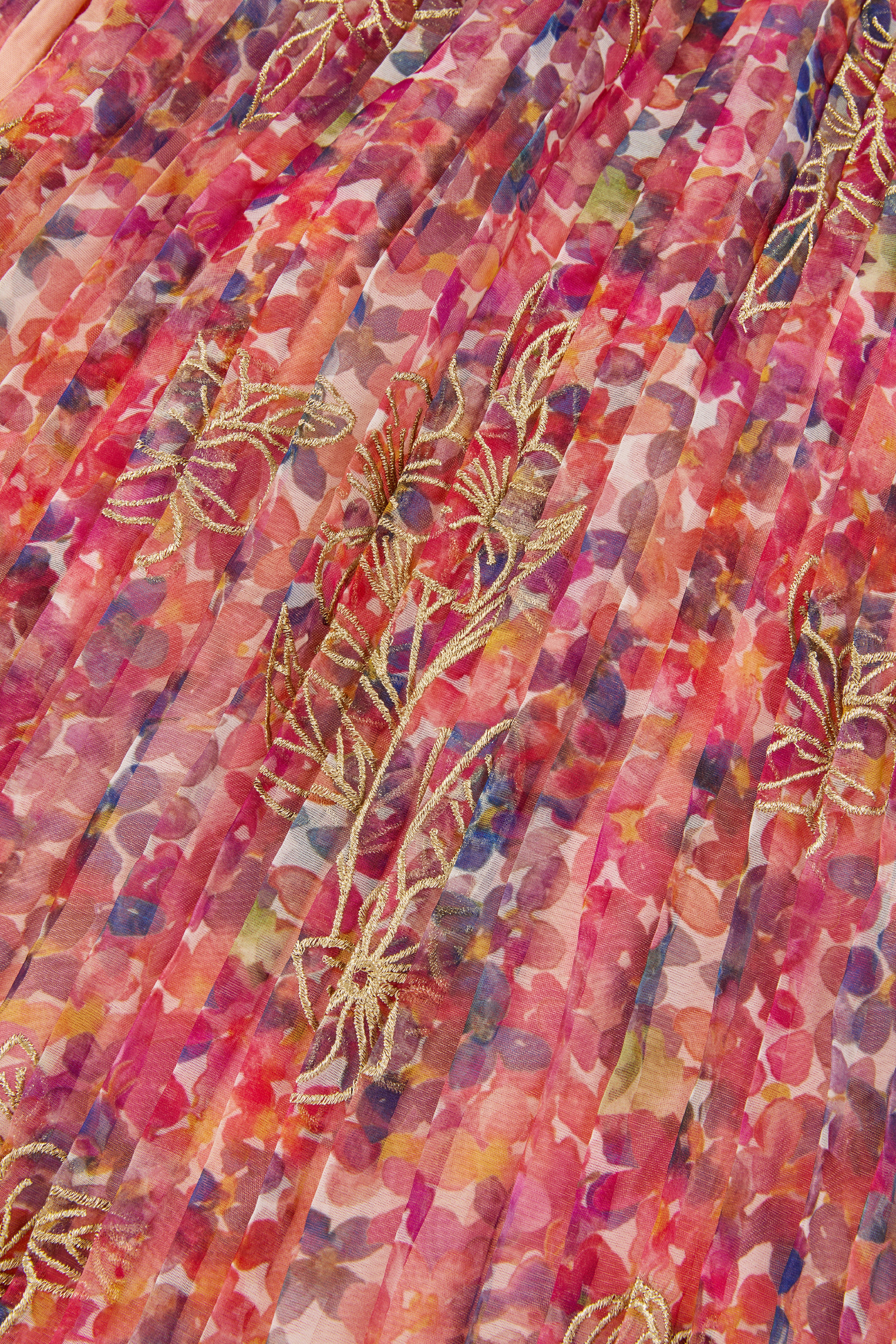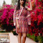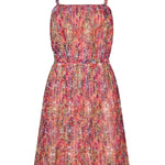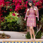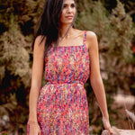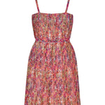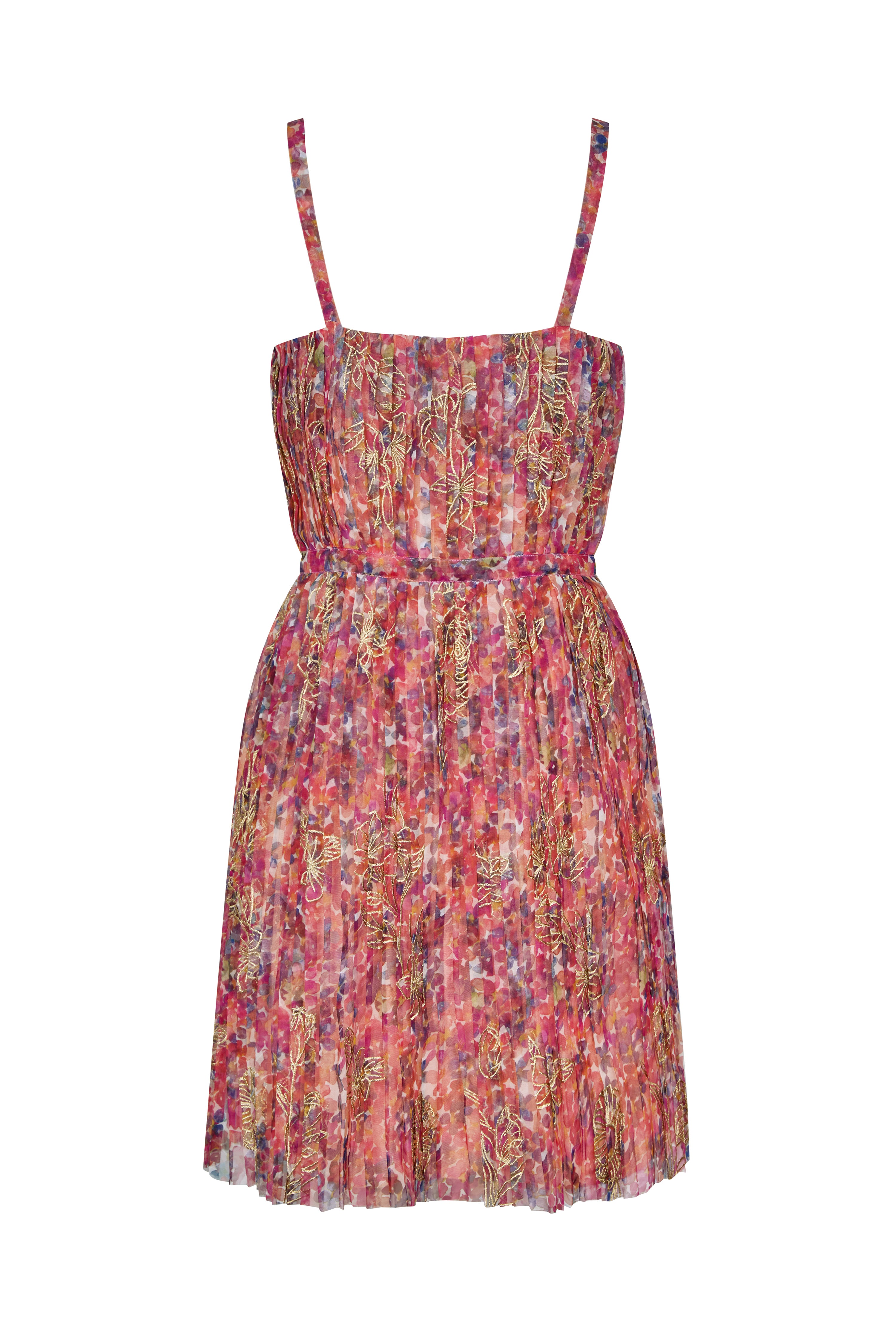 The Iris Pleated Dress features a delicate pleated bodice and skirt crafted from sheer fabric adorned with a watercolor floral print. Embroidered line drawings add subtle sparkle. Fitted at the waist, this dress offers a flattering silhouette perfect for holidays or special occasions.