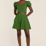 Introducing The Co-Ord in Green, a stylish and sustainable set made from organic cotton. The puffy short sleeves and flared skort create a feminine and flirty look, perfect for summer.