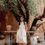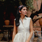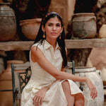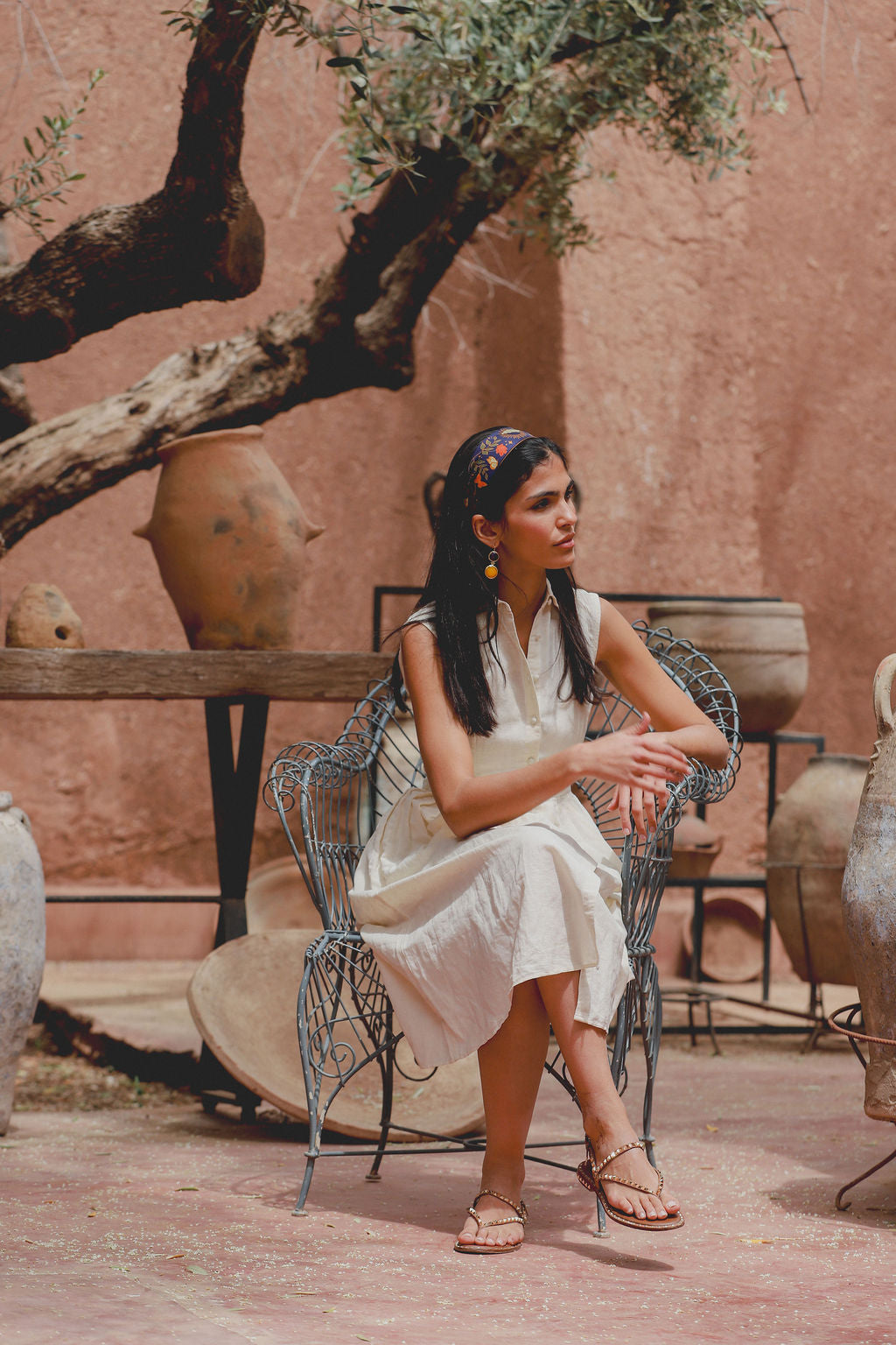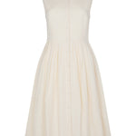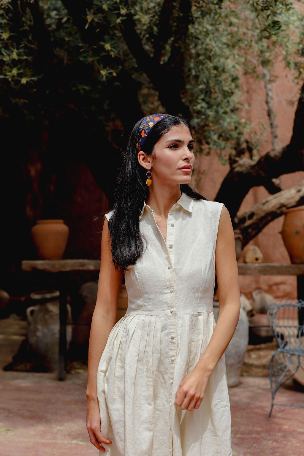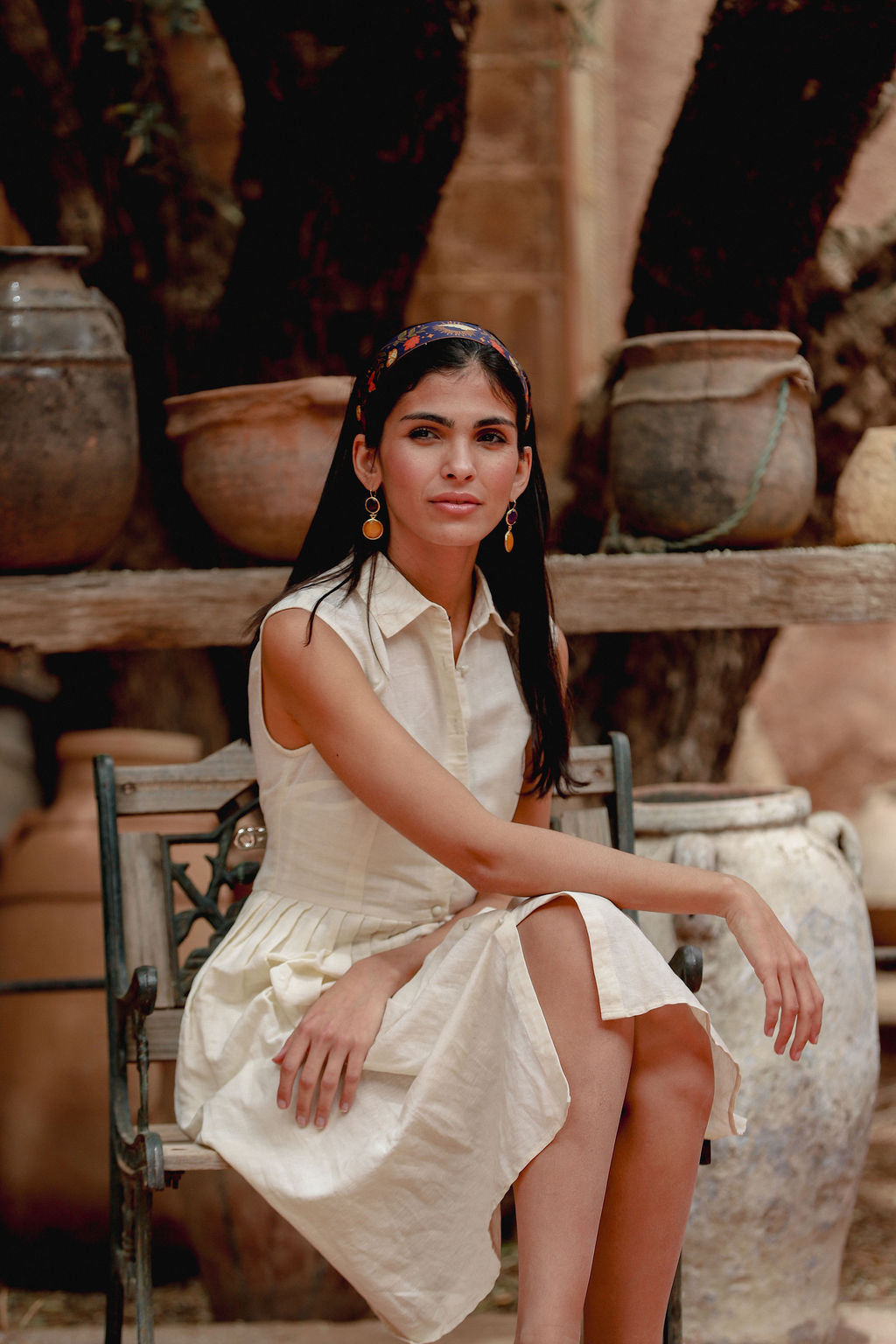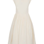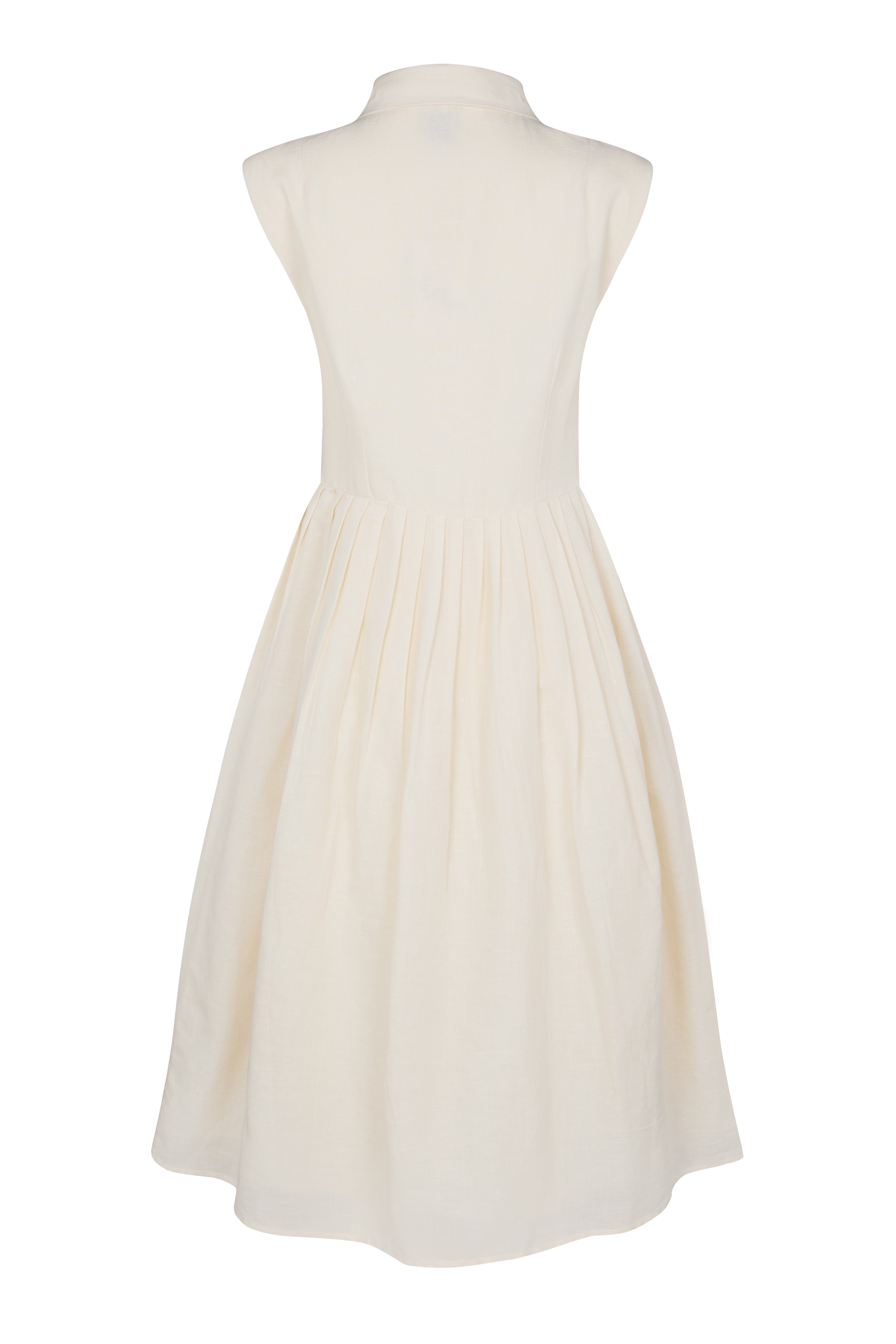 Introducing our best-selling Kōr Shirt Dress in Cream. Made from high-quality European flax certified linen and cotton, this feminine dress features a flared skirt and convenient pockets. Hidden hooks between buttons along the bodice provide a secure fit. Stay stylish and comfortable all day long.